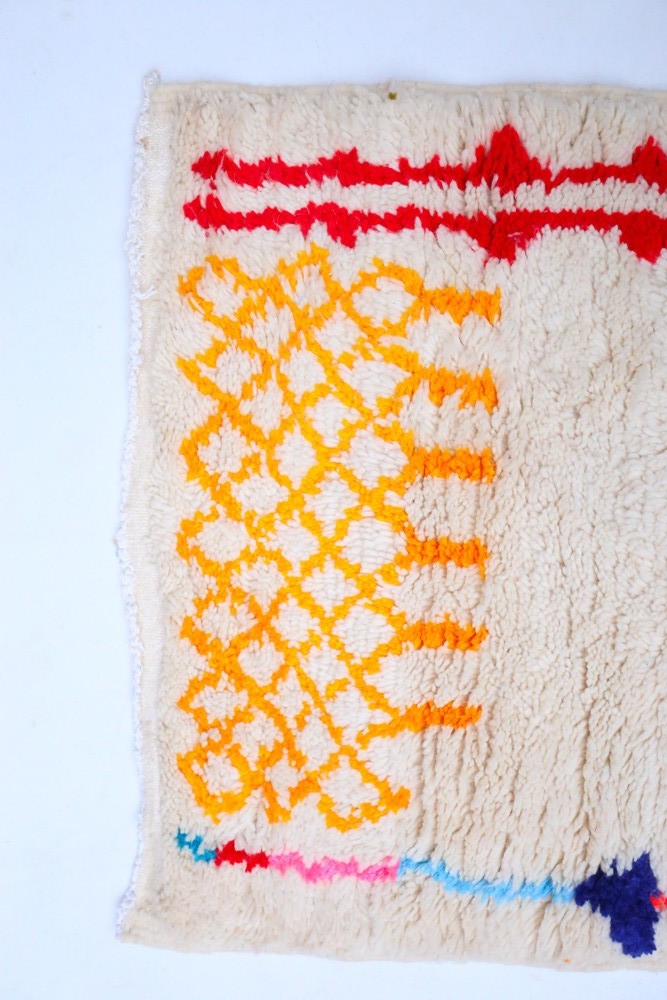 Dieser Berber-Teppich, der Azilal genannt wird, hat seinen Namen von der Region Azilal in Marokko, wo er auf einem traditionellen Holzwebstuhl handgefertigt wurde. Seine Muster spiegeln die Stimmungen, Lieben und Leiden der Weberin zum Zeitpunkt seiner Entstehung wider. Nachdem dieser bunte Berber-Teppich geschaffen wurde, wird sie einen völlig anderen, je nach ihren aktuellen Emotionen, anfertigen. Jedes Stück ist also einzigartig.