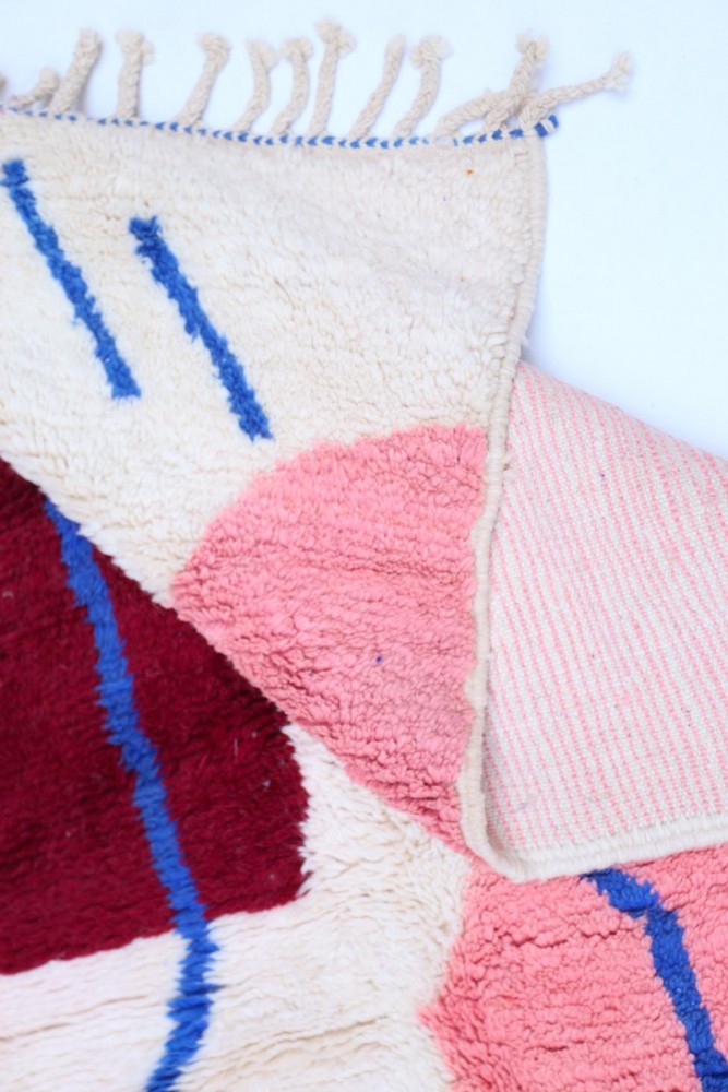 Der sogenannte Azilal-Berberteppich hier hat seinen Namen von der Region Azilal in Marokko, wo er von Hand auf einem traditionellen hölzernen Webstuhl hergestellt wurde. Seine Muster spiegeln die Stimmungen, Lieben und Leiden der Weberin zum Zeitpunkt der Erstellung wider. Nachdem dieser bunte Berberteppich geschaffen wurde, wird sie einen völlig anderen anfertigen, abhängig von ihren aktuellen Emotionen. Jedes Stück ist also ein Unikat.