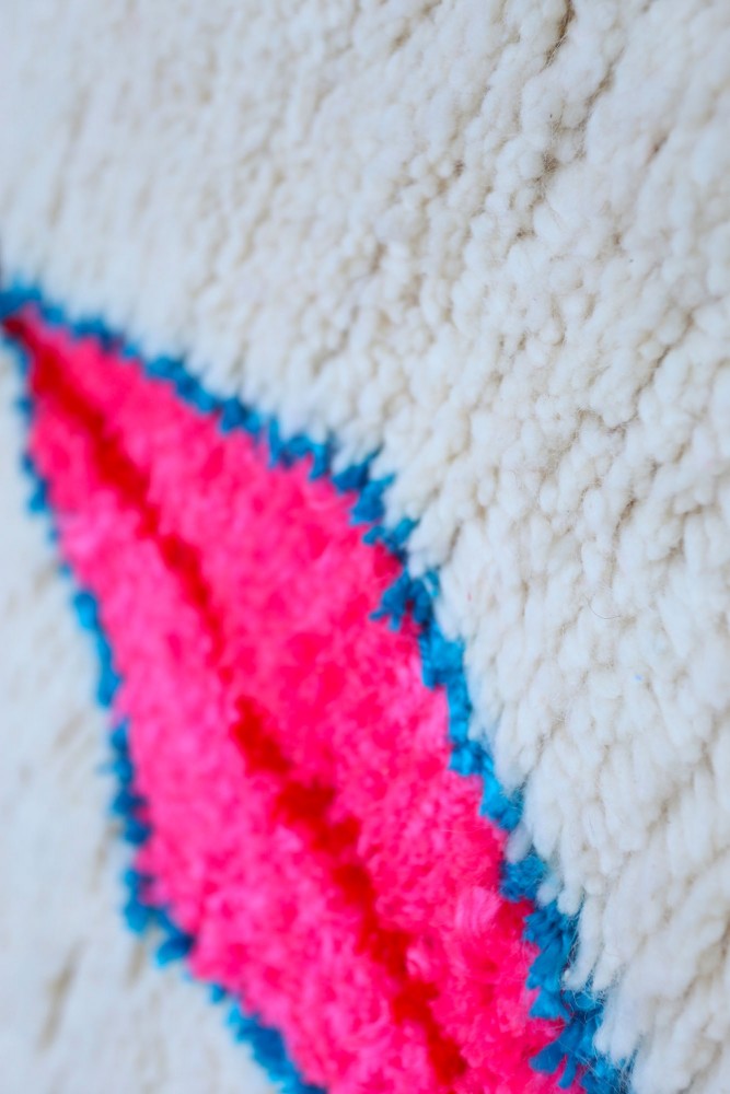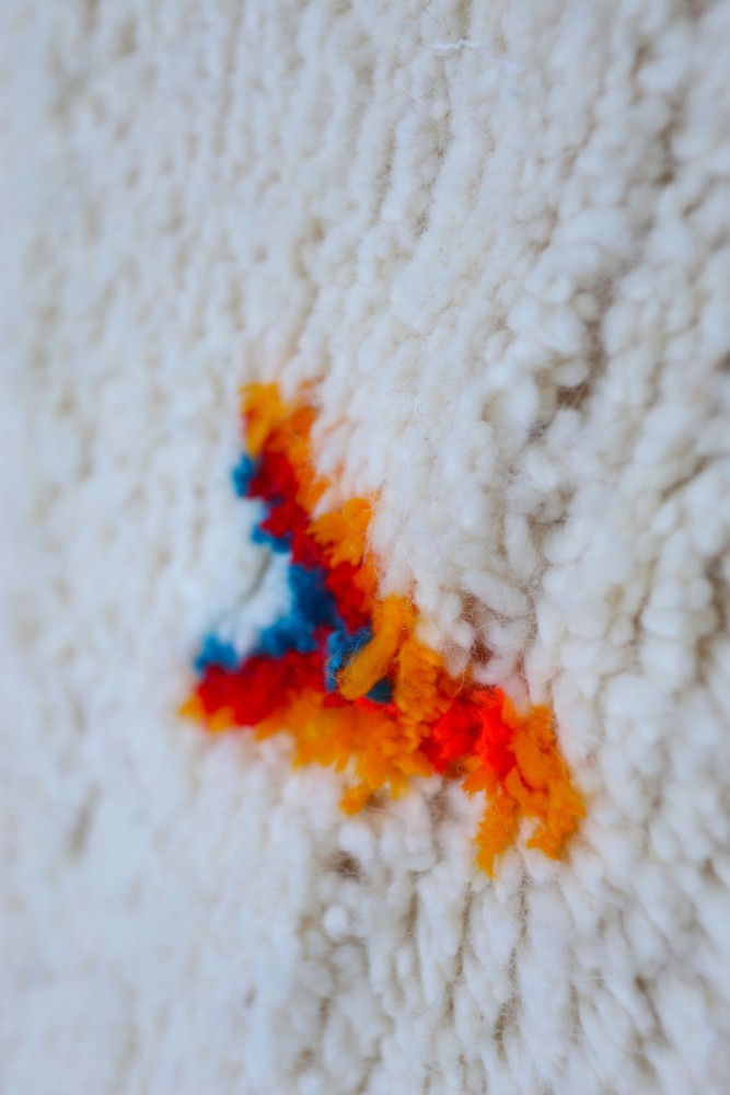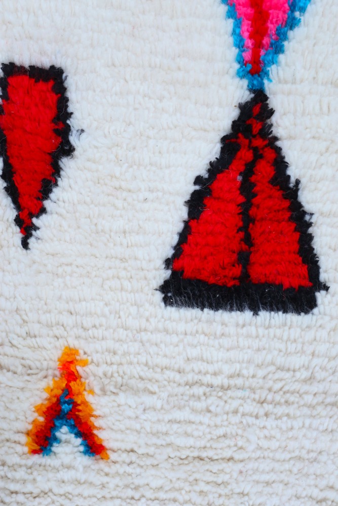 Dieser Berber-Teppich, genannt Azilal, stammt aus der Region Azilal in Marokko, wo er von Hand auf einem traditionellen hölzernen Webstuhl hergestellt wurde. Seine Muster spiegeln die Stimmungen, Lieben und Leiden der Weberin zum Zeitpunkt der Herstellung wider. Nachdem dieser bunte Berber-Teppich kreiert wurde, wird sie einen völlig anderen Teppich herstellen, abhängig von ihren aktuellen Emotionen. Jedes Stück ist daher ein Unikat.