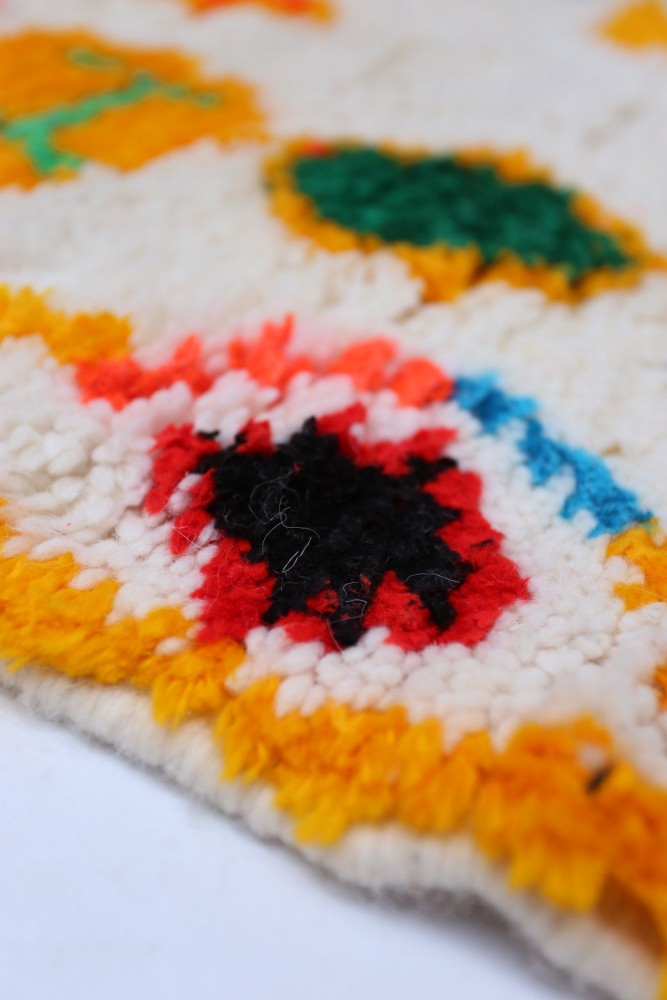 Dieser als Azilal bezeichnete Berber-Teppich hat seinen Namen von der Region Azilal in Marokko, wo er von Hand auf einem traditionellen hölzernen Webstuhl hergestellt wurde. Seine Muster spiegeln die Stimmungen, die Lieben und die Leiden der Weberin zum Zeitpunkt seiner Kreation wider. Nachdem dieser bunte Berber-Teppich erstellt wurde, wird sie einen völlig anderen erstellen, je nach ihren aktuellen Emotionen. Jedes Stück ist also einzigartig.