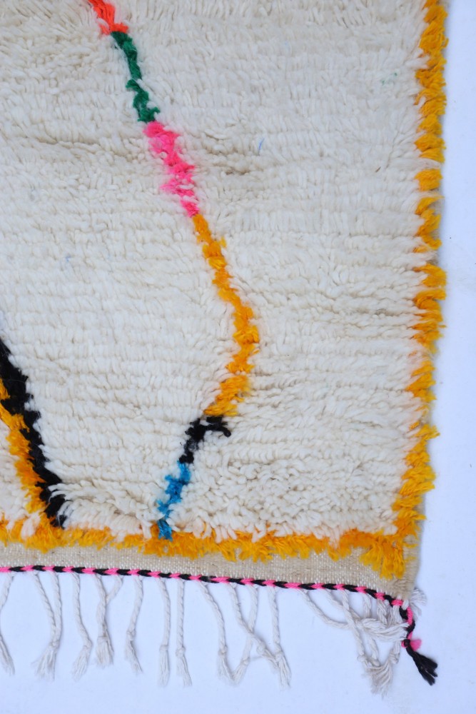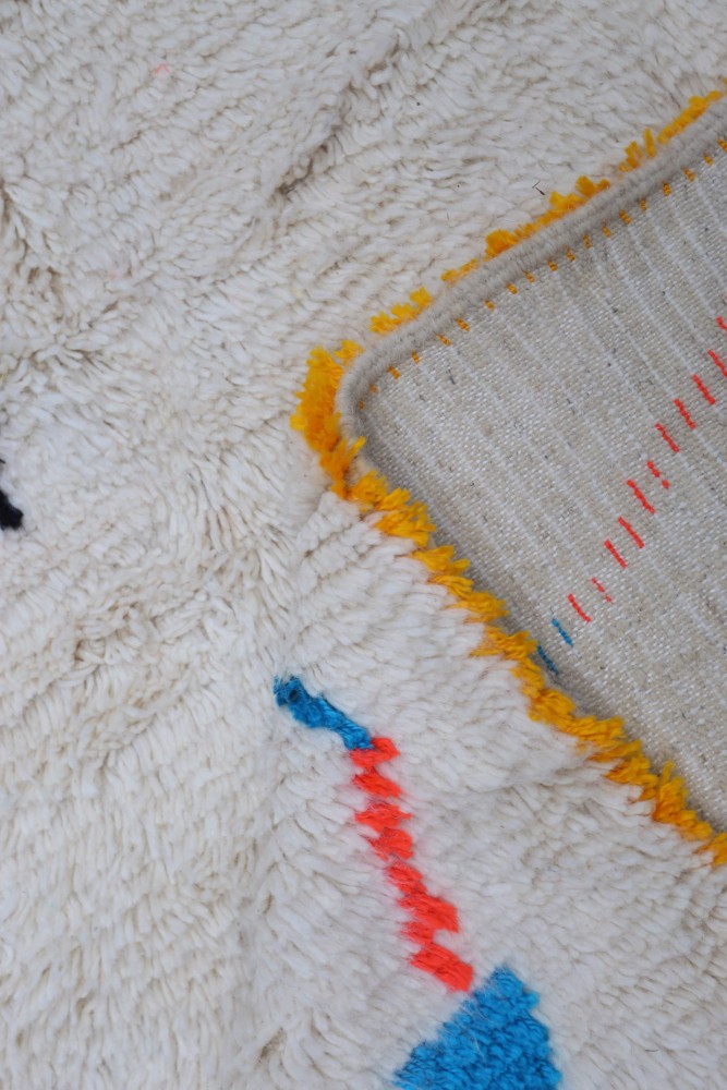 Dieser als Azilal bezeichnete Berber-Teppich hat seinen Namen von der Region Azilal in Marokko, wo er von Hand auf einem traditionellen hölzernen Webstuhl hergestellt wurde. Seine Muster spiegeln die Stimmungen, die Lieben und die Leiden der Weberin zum Zeitpunkt seiner Kreation wider. Nachdem dieser bunte Berber-Teppich erstellt wurde, wird sie einen völlig anderen erstellen, je nach ihren aktuellen Emotionen. Jedes Stück ist also einzigartig.