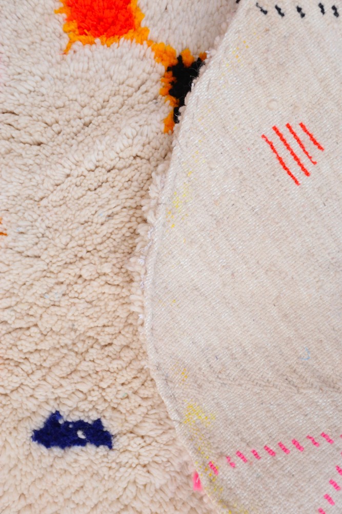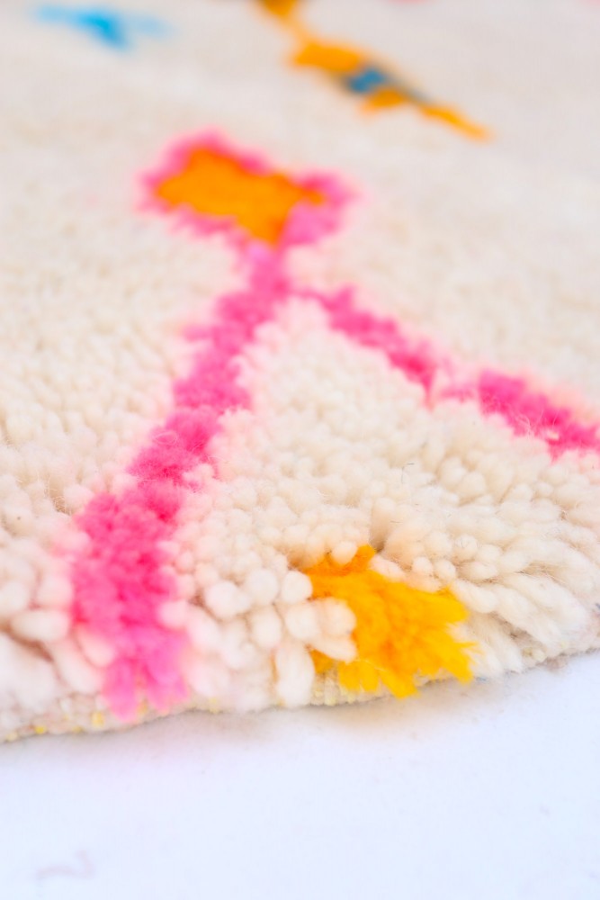 Dieser als Azilal bezeichnete Berber-Teppich hat seinen Namen von der Region Azilal in Marokko, wo er auf einem traditionellen hölzernen Webstuhl von Hand gefertigt wurde. Die Muster repräsentieren die Stimmungen, Lieben und Leiden der Weberin zum Zeitpunkt ihrer Herstellung. Nachdem dieser bunte Berber-Teppich erstellt wurde, wird sie einen völlig anderen anfertigen, je nach ihren aktuellen Emotionen. Jedes Stück ist also einzigartig.