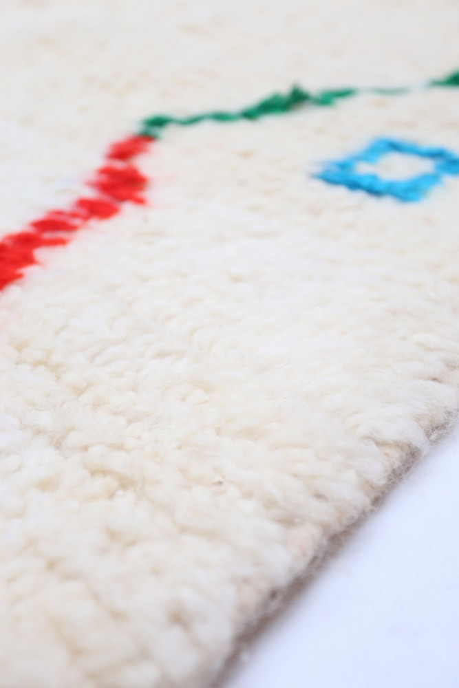 Dieser Berber-Teppich, genannt Azilal, hat seinen Namen von der Region Azilal in Marokko, wo er von Hand auf einem traditionellen hölzernen Webstuhl hergestellt wurde. Seine Muster spiegeln die Stimmungen, Lieben und Leiden der Weberin zum Zeitpunkt seiner Entstehung wider. Nach der Herstellung dieses farbenfrohen Berber-Teppichs wird sie einen völlig anderen anfertigen, je nach ihren aktuellen Emotionen. Jedes Stück ist somit ein Unikat.
