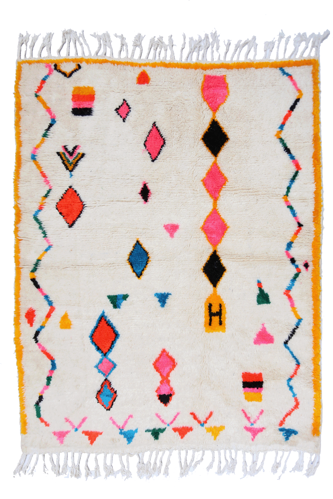Dieser Berber-Teppich, genannt Azilal, hat seinen Namen von der Region Azilal in Marokko, wo er von Hand auf einem traditionellen hölzernen Webstuhl hergestellt wurde. Seine Muster spiegeln die Stimmungen, Lieben und Leiden der Weberin zum Zeitpunkt seiner Entstehung wider. Nach der Herstellung dieses farbenfrohen Berber-Teppichs wird sie einen völlig anderen anfertigen, je nach ihren aktuellen Emotionen. Jedes Stück ist somit ein Unikat.