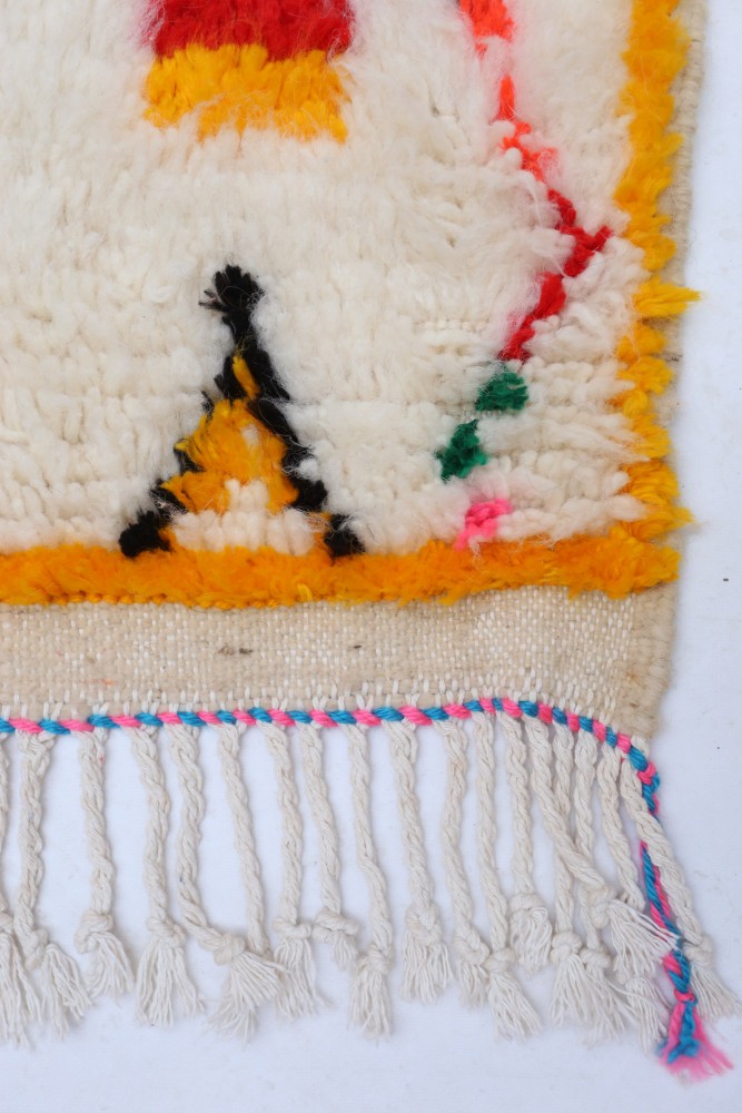 Dieser Berber-Teppich, genannt Azilal, hat seinen Namen von der Region Azilal in Marokko, wo er von Hand auf einem traditionellen hölzernen Webstuhl hergestellt wurde. Seine Muster spiegeln die Stimmungen, Lieben und Leiden der Weberin zum Zeitpunkt seiner Entstehung wider. Nach der Herstellung dieses farbenfrohen Berber-Teppichs wird sie einen völlig anderen anfertigen, je nach ihren aktuellen Emotionen. Jedes Stück ist somit ein Unikat.