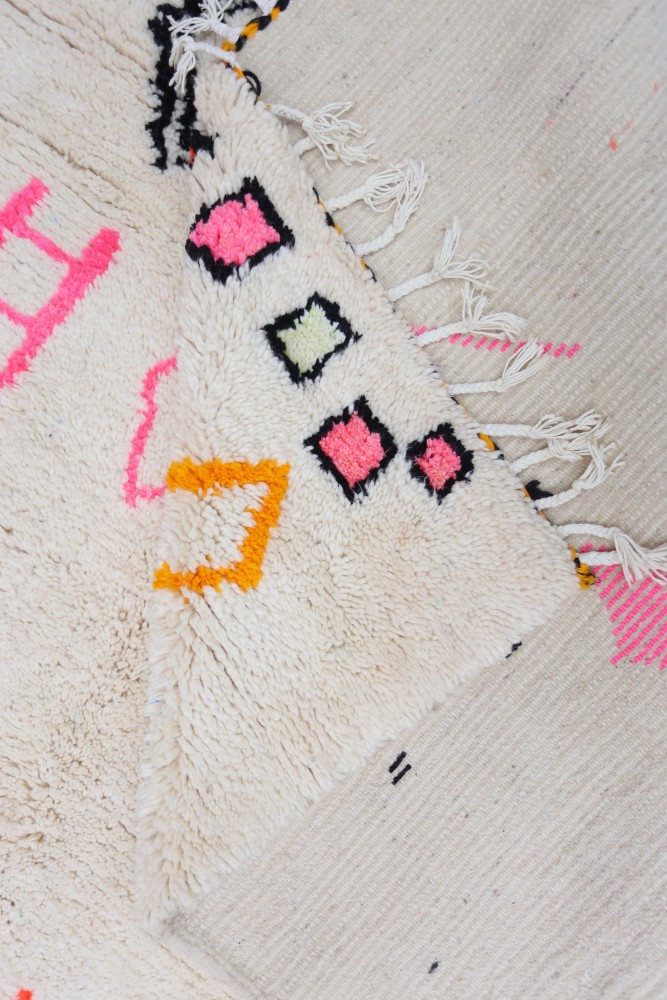 Azilal-Teppich aus Schafwolle, handgefertigt auf einem traditionellen Webstuhl in den Bergen des Atlasgebirges in Marokko.