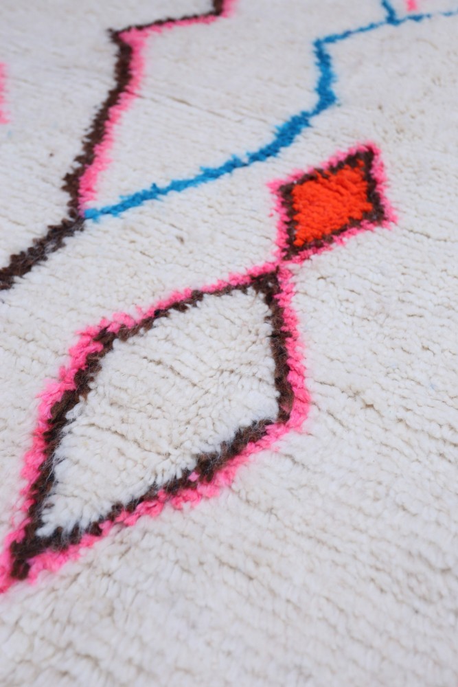 Dieser Berber-Teppich, der Azilal genannt wird, hat seinen Namen von der Region Azilal in Marokko, wo er von Hand auf einem traditionellen hölzernen Webstuhl hergestellt wurde. Seine Muster spiegeln die Stimmungen, Lieben und Leiden der Weberin zum Zeitpunkt seiner Herstellung wider. Nachdem dieser farbenfrohe Berber-Teppich erstellt wurde, wird sie einen völlig anderen Teppich anfertigen, je nach ihren aktuellen Emotionen. Jedes Stück ist also einzigartig.