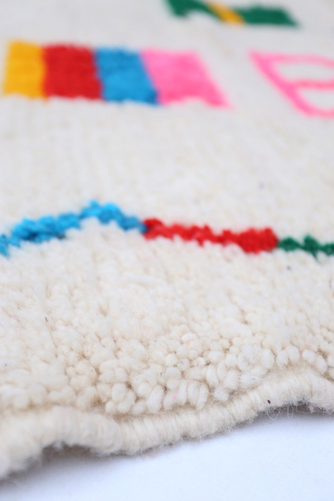 Dieser Berber-Teppich, genannt Azilal, stammt aus der Region Azilal in Marokko, wo er auf einem traditionellen hölzernen Webstuhl handgefertigt wurde. Seine Muster spiegeln die Stimmungen, Lieben und Leiden der Weberin zum Zeitpunkt seiner Entstehung wider. Nach der Erstellung dieses farbenfrohen Berber-Teppichs wird sie einen völlig anderen Teppich anfertigen, je nach ihren aktuellen Emotionen. Jedes Stück ist also einzigartig.