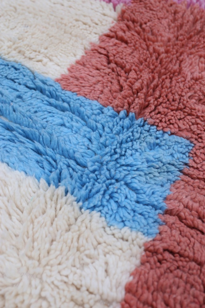 Ce tapis berbère que l'on appelle Azilal tient son nom de la région d'Azilal au Maroc où il a été confectionné à la main sur un métier à tisser traditionnel en bois. Ses motifs représentent les humeurs, les amours, les peines de la tisseuse au moment de sa création. Une fois ce tapis berbère coloré créé, elle en confectionnera un autre totalement différent, en fonction de ses émotions du moment. Chaque pièce est donc unique.