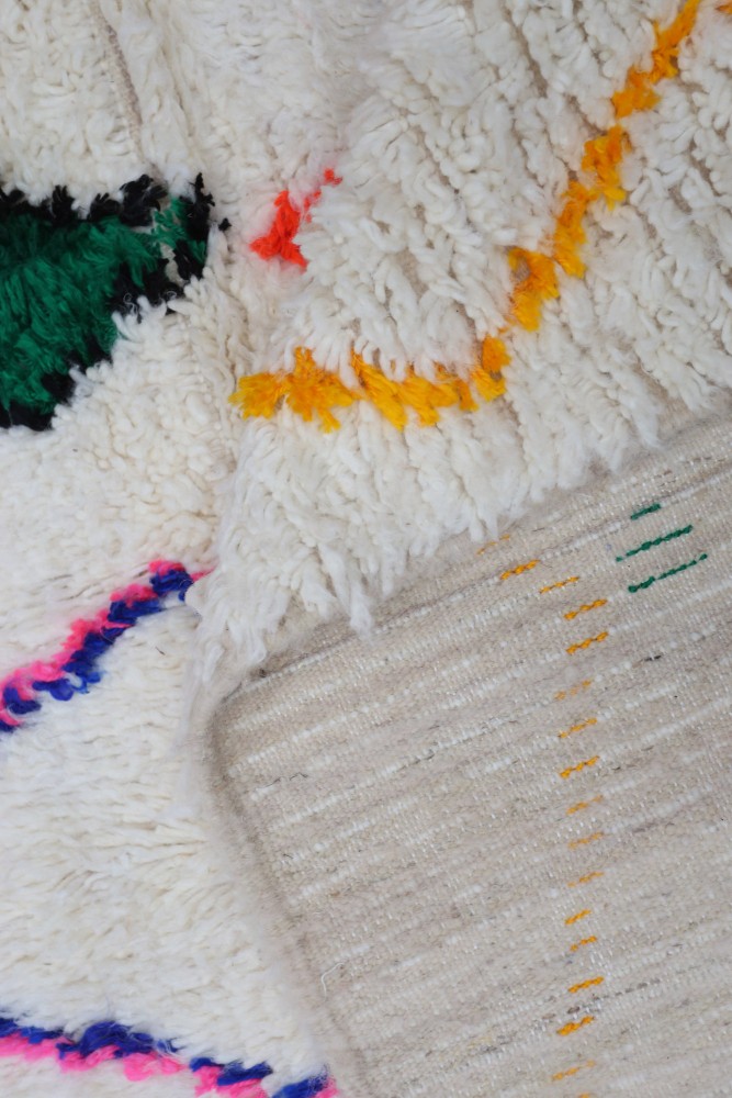 Dieser Berber-Teppich, genannt Azilal, stammt aus der Region Azilal in Marokko, wo er auf einem traditionellen hölzernen Webstuhl handgefertigt wurde. Seine Muster spiegeln die Stimmungen, Lieben und Leiden der Weberin zum Zeitpunkt seiner Entstehung wider. Nach der Erstellung dieses farbenfrohen Berber-Teppichs wird sie einen völlig anderen Teppich anfertigen, je nach ihren aktuellen Emotionen. Jedes Stück ist also einzigartig.