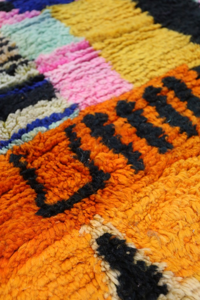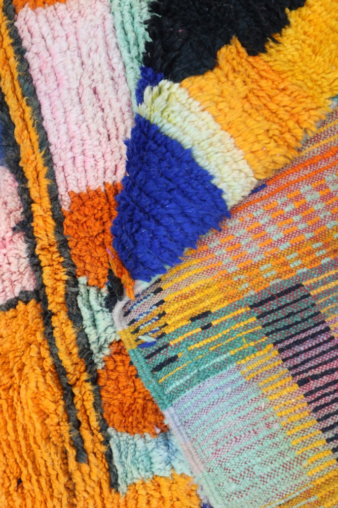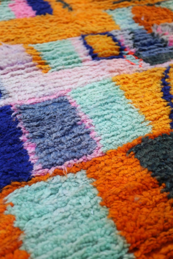 Dieser Berber-Teppich, genannt Azilal, stammt aus der Region Azilal in Marokko, wo er auf einem traditionellen hölzernen Webstuhl handgefertigt wurde. Seine Muster spiegeln die Stimmungen, Lieben und Leiden der Weberin zum Zeitpunkt seiner Entstehung wider. Nach der Erstellung dieses farbenfrohen Berber-Teppichs wird sie einen völlig anderen Teppich anfertigen, je nach ihren aktuellen Emotionen. Jedes Stück ist also einzigartig.