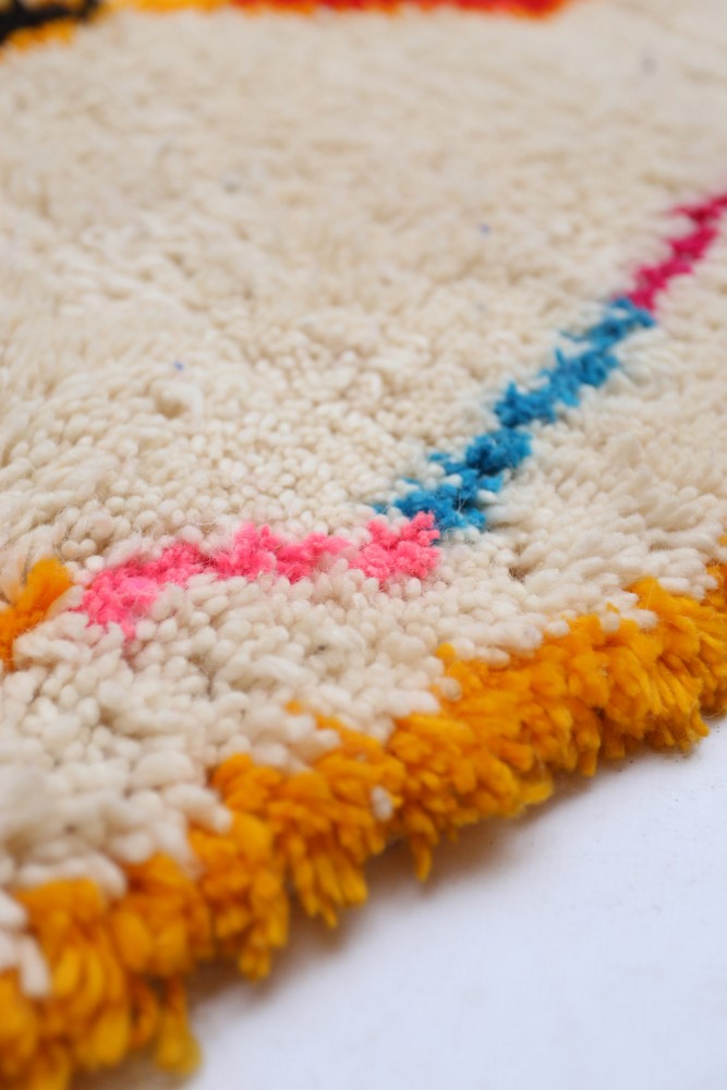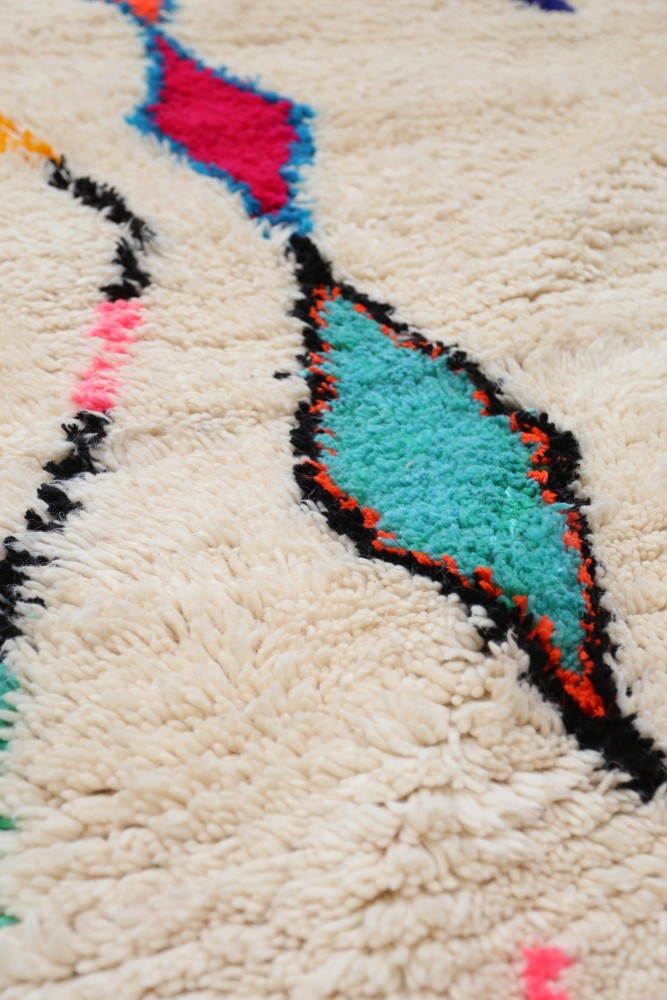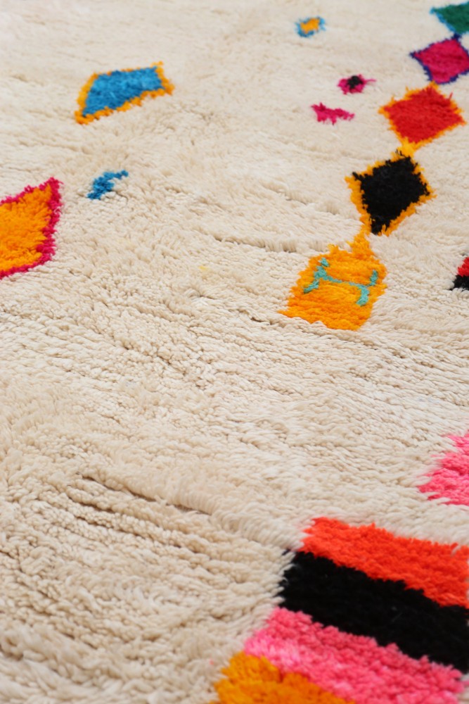 Dieser Berber-Teppich, genannt Azilal, hat seinen Namen von der Region Azilal in Marokko, wo er von Hand auf einem traditionellen hölzernen Webstuhl hergestellt wurde. Seine Muster spiegeln die Stimmungen, Lieben und Leiden der Weberin zum Zeitpunkt seiner Entstehung wider. Nachdem dieser bunte Berber-Teppich hergestellt wurde, wird sie einen völlig anderen Teppich herstellen, abhängig von ihren aktuellen Emotionen. Jedes Stück ist daher einzigartig.