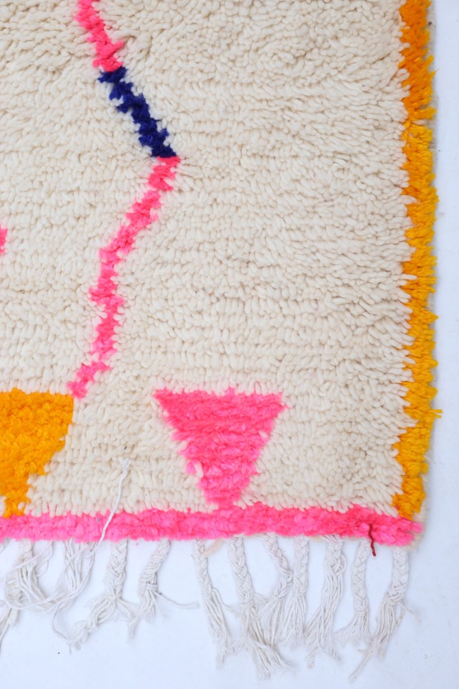 Dieser Berber-Teppich, genannt Azilal, hat seinen Namen von der Region Azilal in Marokko, wo er von Hand auf einem traditionellen hölzernen Webstuhl hergestellt wurde. Seine Muster spiegeln die Stimmungen, Lieben und Leiden der Weberin zum Zeitpunkt seiner Entstehung wider. Nachdem dieser bunte Berber-Teppich hergestellt wurde, wird sie einen völlig anderen Teppich herstellen, abhängig von ihren aktuellen Emotionen. Jedes Stück ist daher einzigartig.