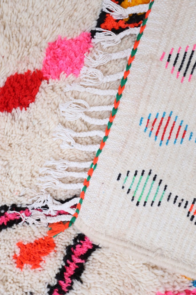 Dieser Berber-Teppich, genannt Azilal, hat seinen Namen von der Region Azilal in Marokko, wo er von Hand auf einem traditionellen hölzernen Webstuhl hergestellt wurde. Seine Muster spiegeln die Stimmungen, Lieben und Leiden der Weberin zum Zeitpunkt seiner Entstehung wider. Nachdem dieser bunte Berber-Teppich hergestellt wurde, wird sie einen völlig anderen Teppich herstellen, abhängig von ihren aktuellen Emotionen. Jedes Stück ist daher einzigartig.