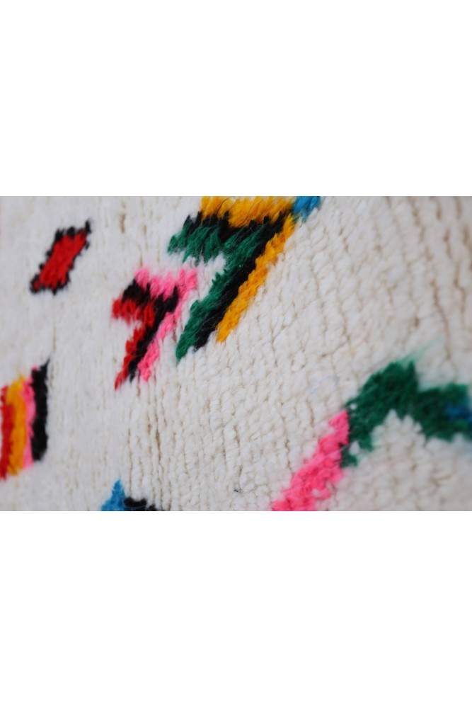 Dieser Berber-Teppich, genannt Azilal, hat seinen Namen von der Region Azilal in Marokko, wo er von Hand auf einem traditionellen hölzernen Webstuhl hergestellt wurde. Seine Muster spiegeln die Stimmungen, Lieben und Leiden der Weberin zum Zeitpunkt seiner Entstehung wider. Nachdem dieser bunte Berber-Teppich hergestellt wurde, wird sie einen völlig anderen Teppich herstellen, abhängig von ihren aktuellen Emotionen. Jedes Stück ist daher einzigartig.