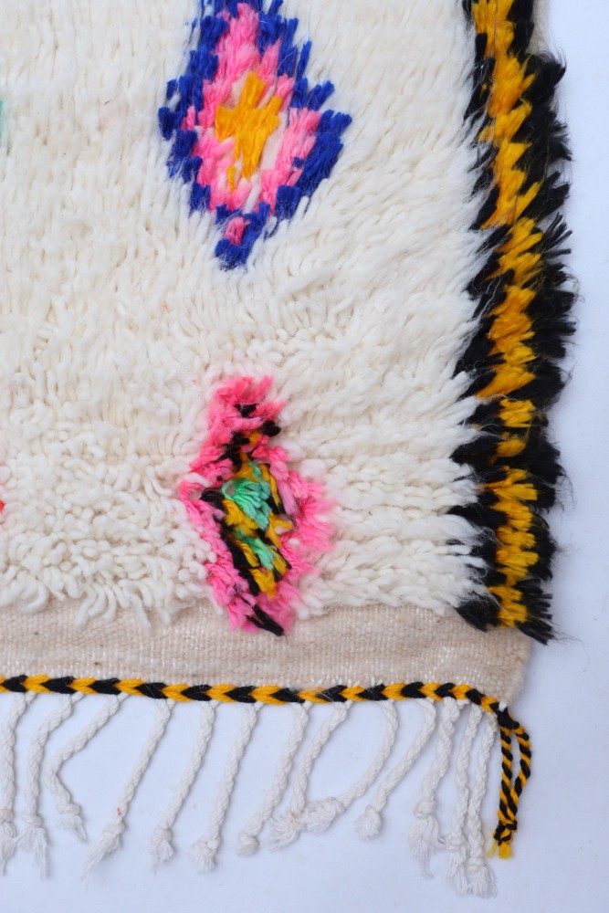 Dieser Berber-Teppich, genannt Azilal, hat seinen Namen von der Region Azilal in Marokko, wo er von Hand auf einem traditionellen hölzernen Webstuhl hergestellt wurde. Seine Muster spiegeln die Stimmungen, Lieben und Leiden der Weberin zum Zeitpunkt seiner Entstehung wider. Nachdem dieser bunte Berber-Teppich hergestellt wurde, wird sie einen völlig anderen Teppich herstellen, abhängig von ihren aktuellen Emotionen. Jedes Stück ist daher einzigartig.