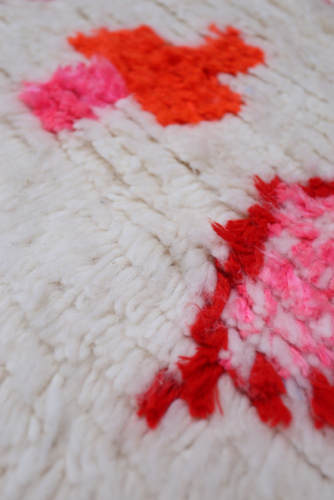 Dieser Berber-Teppich, genannt Azilal, hat seinen Namen von der Region Azilal in Marokko, wo er von Hand auf einem traditionellen hölzernen Webstuhl hergestellt wurde. Seine Muster spiegeln die Stimmungen, Lieben und Leiden der Weberin zum Zeitpunkt seiner Entstehung wider. Nachdem dieser bunte Berber-Teppich hergestellt wurde, wird sie einen völlig anderen Teppich herstellen, abhängig von ihren aktuellen Emotionen. Jedes Stück ist daher einzigartig.