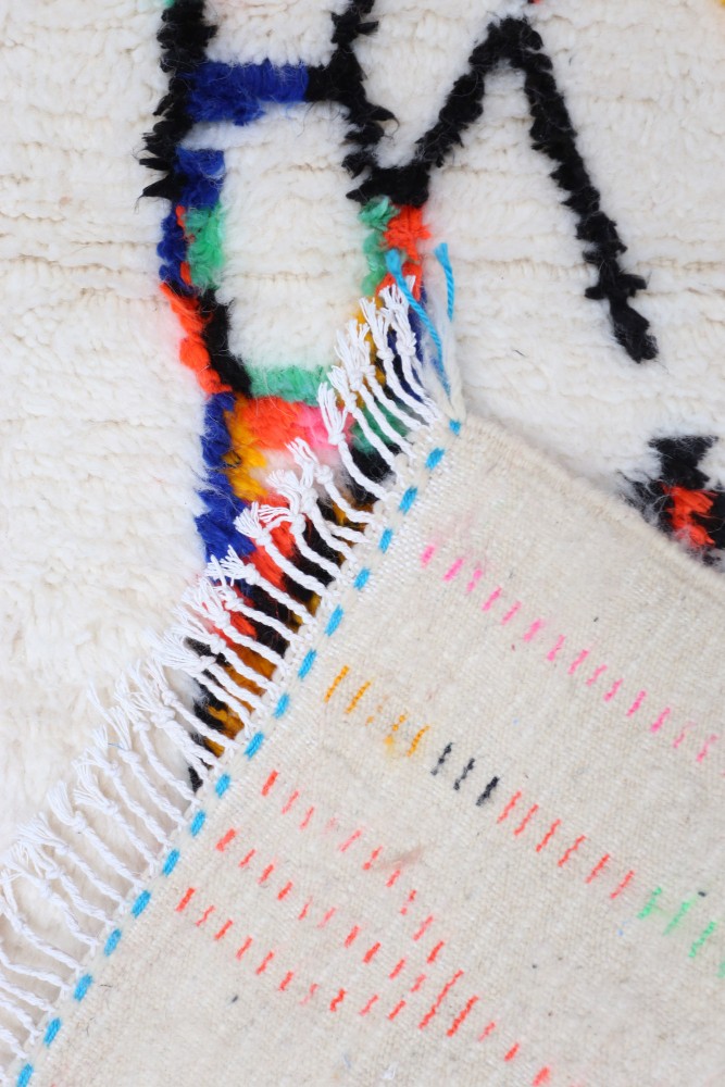 Dieser Berber-Teppich, genannt Azilal, hat seinen Namen von der Region Azilal in Marokko, wo er von Hand auf einem traditionellen hölzernen Webstuhl hergestellt wurde. Seine Muster spiegeln die Stimmungen, Lieben und Leiden der Weberin zum Zeitpunkt seiner Entstehung wider. Nachdem dieser bunte Berber-Teppich hergestellt wurde, wird sie einen völlig anderen Teppich herstellen, abhängig von ihren aktuellen Emotionen. Jedes Stück ist daher einzigartig.