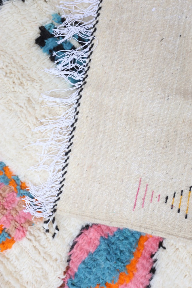 Dieser Berber-Teppich, genannt Azilal, hat seinen Namen von der Region Azilal in Marokko, wo er von Hand auf einem traditionellen hölzernen Webstuhl hergestellt wurde. Seine Muster spiegeln die Stimmungen, Lieben und Leiden der Weberin zum Zeitpunkt seiner Entstehung wider. Nachdem dieser bunte Berber-Teppich hergestellt wurde, wird sie einen völlig anderen Teppich herstellen, abhängig von ihren aktuellen Emotionen. Jedes Stück ist daher einzigartig.