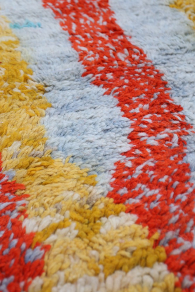 Dieser Berber-Teppich, genannt Azilal, hat seinen Namen von der Region Azilal in Marokko, wo er von Hand auf einem traditionellen hölzernen Webstuhl hergestellt wurde. Seine Muster spiegeln die Stimmungen, Lieben und Leiden der Weberin zum Zeitpunkt seiner Entstehung wider. Nachdem dieser bunte Berber-Teppich hergestellt wurde, wird sie einen völlig anderen Teppich herstellen, abhängig von ihren aktuellen Emotionen. Jedes Stück ist daher einzigartig.