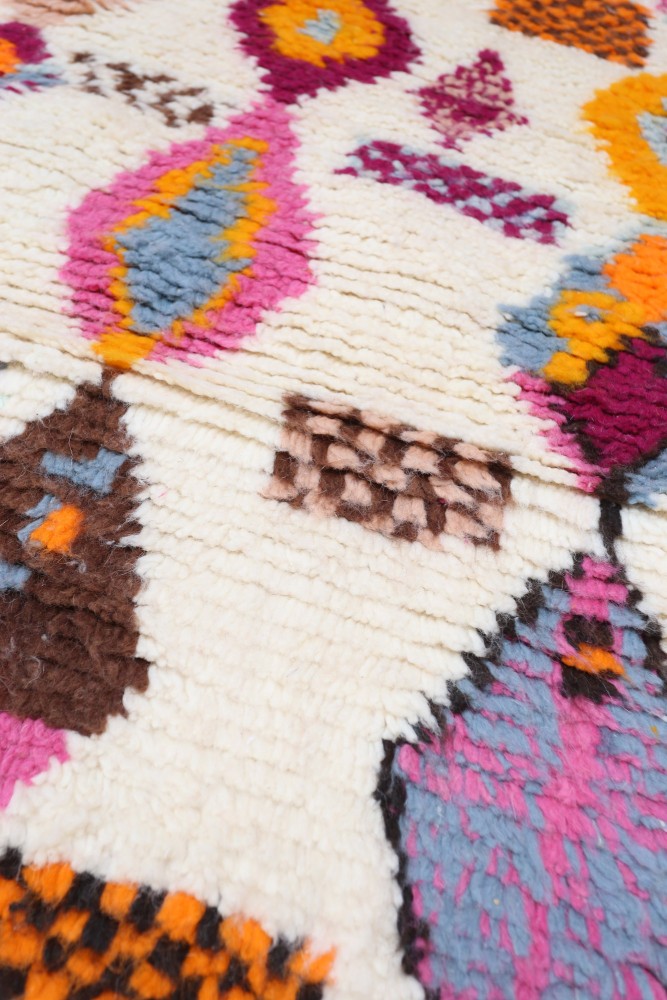Der so genannte Azilal-Berber-Teppich wurde nach der Region Azilal in Marokko benannt, wo er von Hand an einem traditionellen Holzwebstuhl hergestellt wurde. Seine Muster repräsentieren die Stimmungen, Lieben und Leiden der Weberin zum Zeitpunkt seiner Erstellung. Nachdem dieser bunte Berber-Teppich geschaffen wurde, wird sie einen völlig anderen Teppich anfertigen, abhängig von ihren aktuellen Emotionen. Jedes Stück ist also einzigartig.
