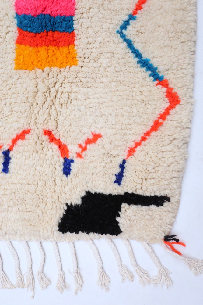 Der so genannte Azilal-Berber-Teppich wurde nach der Region Azilal in Marokko benannt, wo er von Hand an einem traditionellen Holzwebstuhl hergestellt wurde. Seine Muster repräsentieren die Stimmungen, Lieben und Leiden der Weberin zum Zeitpunkt seiner Erstellung. Nachdem dieser bunte Berber-Teppich geschaffen wurde, wird sie einen völlig anderen Teppich anfertigen, abhängig von ihren aktuellen Emotionen. Jedes Stück ist also einzigartig.