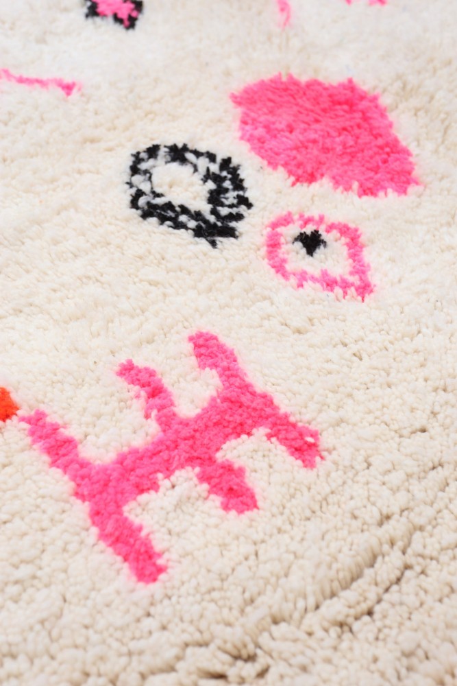 Der so genannte Azilal-Berber-Teppich wurde nach der Region Azilal in Marokko benannt, wo er von Hand an einem traditionellen Holzwebstuhl hergestellt wurde. Seine Muster repräsentieren die Stimmungen, Lieben und Leiden der Weberin zum Zeitpunkt seiner Erstellung. Nachdem dieser bunte Berber-Teppich geschaffen wurde, wird sie einen völlig anderen Teppich anfertigen, abhängig von ihren aktuellen Emotionen. Jedes Stück ist also einzigartig.