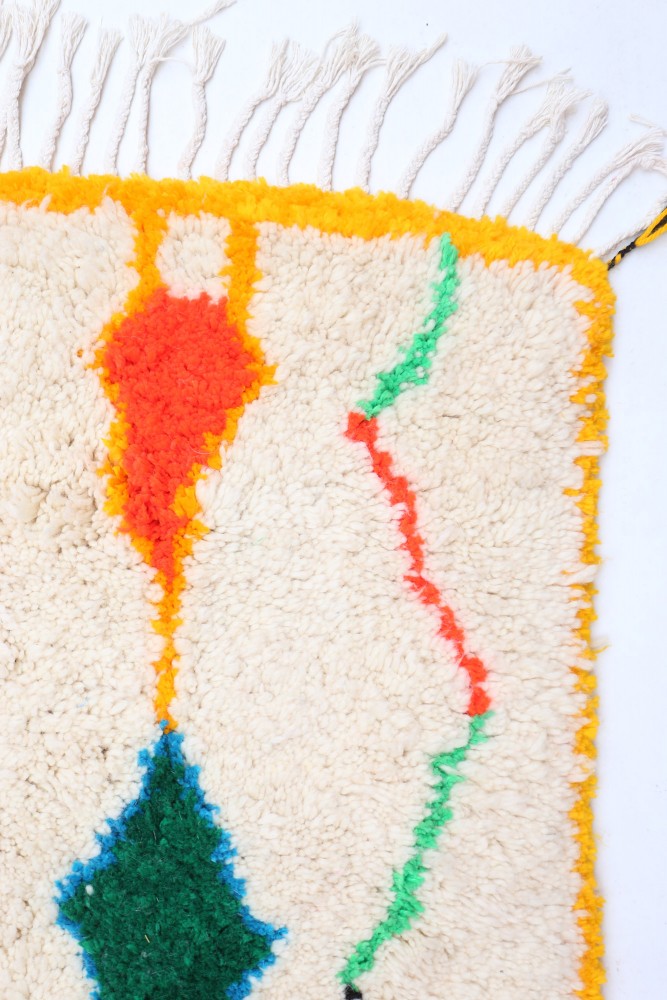 Der so genannte Azilal-Berber-Teppich wurde nach der Region Azilal in Marokko benannt, wo er von Hand an einem traditionellen Holzwebstuhl hergestellt wurde. Seine Muster repräsentieren die Stimmungen, Lieben und Leiden der Weberin zum Zeitpunkt seiner Erstellung. Nachdem dieser bunte Berber-Teppich geschaffen wurde, wird sie einen völlig anderen Teppich anfertigen, abhängig von ihren aktuellen Emotionen. Jedes Stück ist also einzigartig.