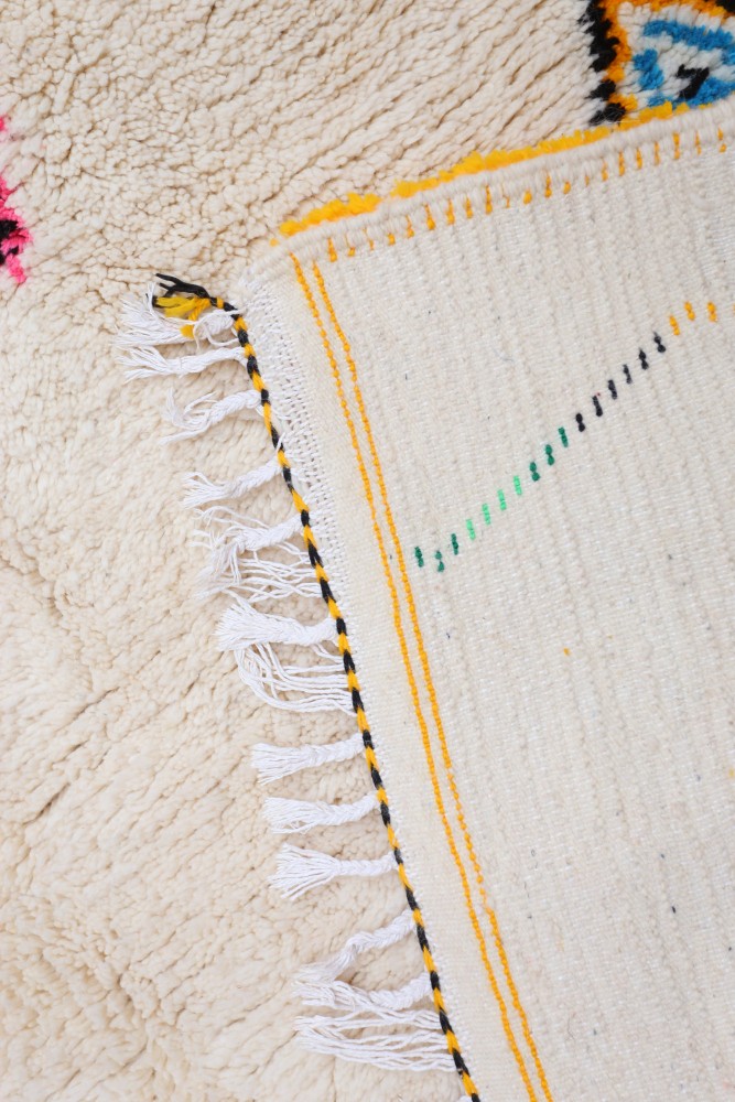 Der so genannte Azilal-Berber-Teppich wurde nach der Region Azilal in Marokko benannt, wo er von Hand an einem traditionellen Holzwebstuhl hergestellt wurde. Seine Muster repräsentieren die Stimmungen, Lieben und Leiden der Weberin zum Zeitpunkt seiner Erstellung. Nachdem dieser bunte Berber-Teppich geschaffen wurde, wird sie einen völlig anderen Teppich anfertigen, abhängig von ihren aktuellen Emotionen. Jedes Stück ist also einzigartig.