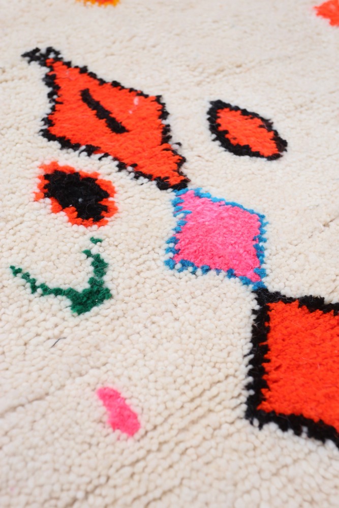 Der so genannte Azilal-Berber-Teppich wurde nach der Region Azilal in Marokko benannt, wo er von Hand an einem traditionellen Holzwebstuhl hergestellt wurde. Seine Muster repräsentieren die Stimmungen, Lieben und Leiden der Weberin zum Zeitpunkt seiner Erstellung. Nachdem dieser bunte Berber-Teppich geschaffen wurde, wird sie einen völlig anderen Teppich anfertigen, abhängig von ihren aktuellen Emotionen. Jedes Stück ist also einzigartig.