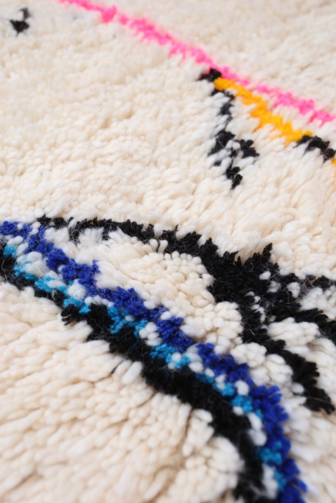 Der so genannte Azilal-Berber-Teppich wurde nach der Region Azilal in Marokko benannt, wo er von Hand an einem traditionellen Holzwebstuhl hergestellt wurde. Seine Muster repräsentieren die Stimmungen, Lieben und Leiden der Weberin zum Zeitpunkt seiner Erstellung. Nachdem dieser bunte Berber-Teppich geschaffen wurde, wird sie einen völlig anderen Teppich anfertigen, abhängig von ihren aktuellen Emotionen. Jedes Stück ist also einzigartig.