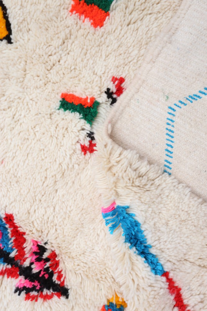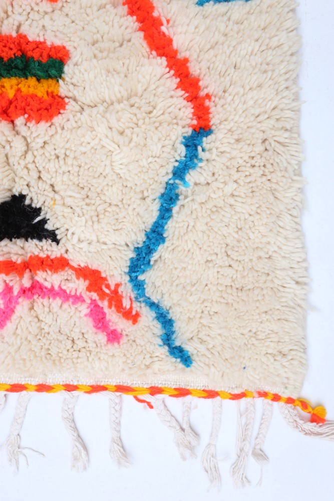 Der so genannte Azilal-Berber-Teppich wurde nach der Region Azilal in Marokko benannt, wo er von Hand an einem traditionellen Holzwebstuhl hergestellt wurde. Seine Muster repräsentieren die Stimmungen, Lieben und Leiden der Weberin zum Zeitpunkt seiner Erstellung. Nachdem dieser bunte Berber-Teppich geschaffen wurde, wird sie einen völlig anderen Teppich anfertigen, abhängig von ihren aktuellen Emotionen. Jedes Stück ist also einzigartig.