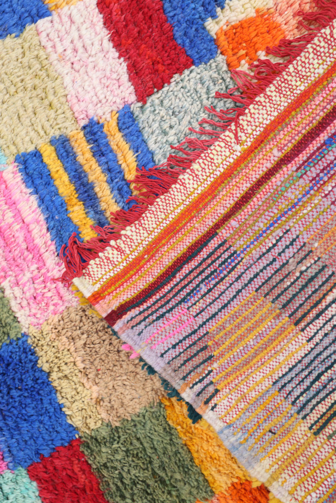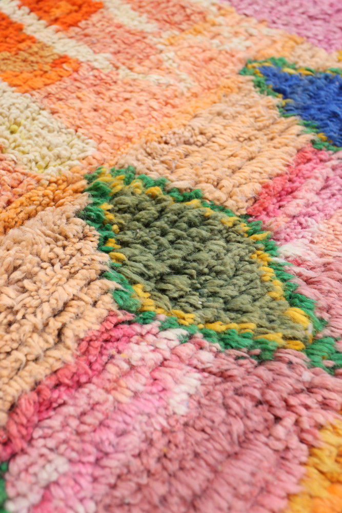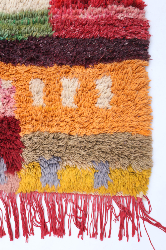 Dieser Berber-Teppich, genannt Azilal, hat seinen Namen von der Region Azilal in Marokko, wo er von Hand auf einem traditionellen hölzernen Webstuhl hergestellt wurde. Seine Muster spiegeln die Stimmungen, Lieben und Leiden der Weberin zum Zeitpunkt seiner Entstehung wider. Nachdem dieser bunte Berber-Teppich fertiggestellt ist, wird sie einen völlig anderen herstellen, je nach ihren aktuellen Emotionen. Jedes Stück ist also einzigartig.