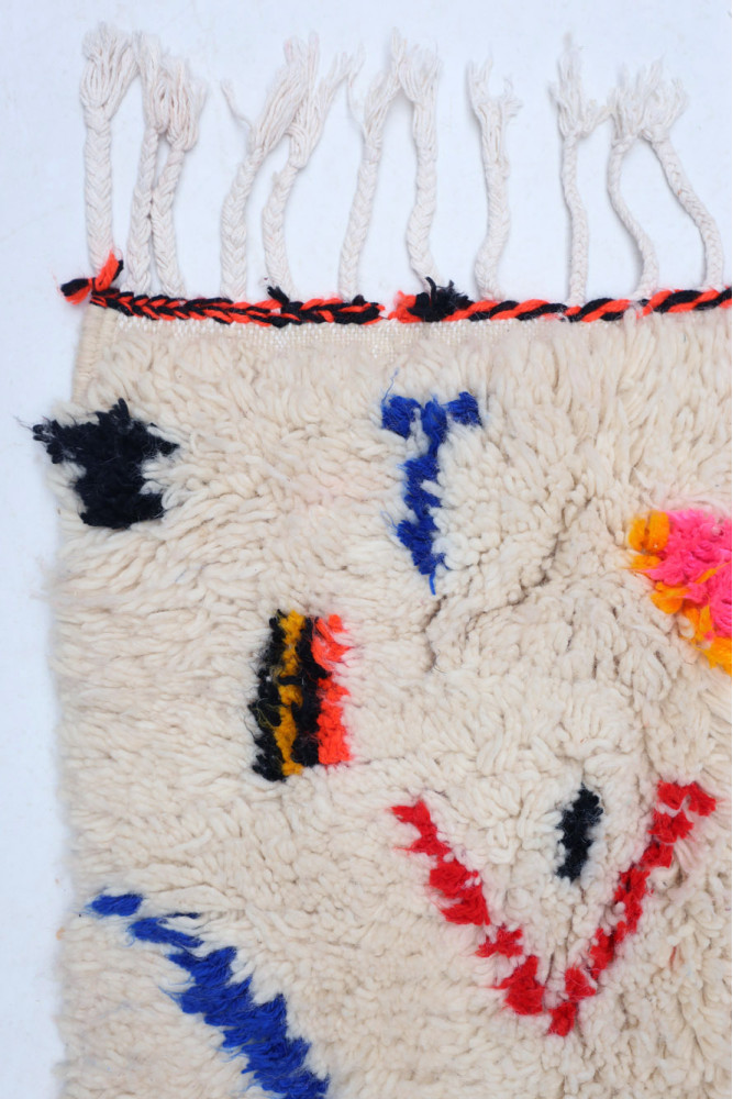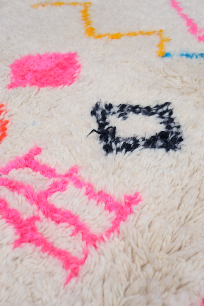 Dieser Berber-Teppich, genannt Azilal, hat seinen Namen von der Region Azilal in Marokko, wo er von Hand auf einem traditionellen hölzernen Webstuhl hergestellt wurde. Seine Muster spiegeln die Stimmungen, Lieben und Leiden der Weberin zum Zeitpunkt seiner Entstehung wider. Nachdem dieser bunte Berber-Teppich fertiggestellt ist, wird sie einen völlig anderen herstellen, je nach ihren aktuellen Emotionen. Jedes Stück ist also einzigartig.