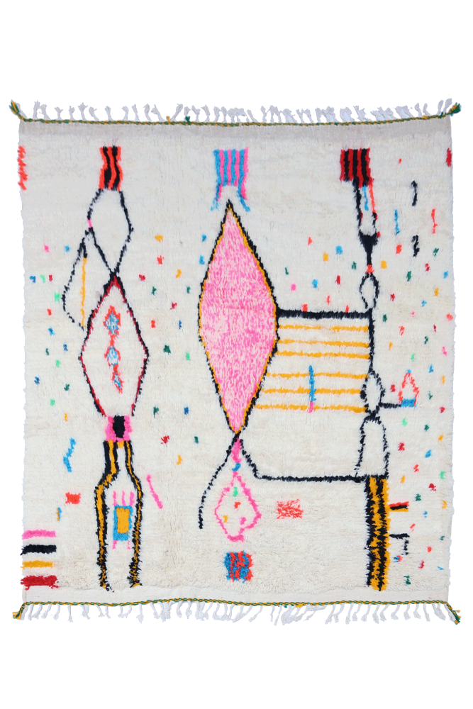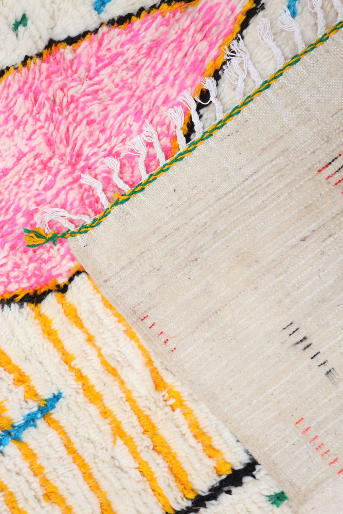 Dieser Berber-Teppich, genannt Azilal, hat seinen Namen von der Region Azilal in Marokko, wo er von Hand auf einem traditionellen hölzernen Webstuhl hergestellt wurde. Seine Muster spiegeln die Stimmungen, Lieben und Leiden der Weberin zum Zeitpunkt seiner Entstehung wider. Nachdem dieser bunte Berber-Teppich fertiggestellt ist, wird sie einen völlig anderen herstellen, je nach ihren aktuellen Emotionen. Jedes Stück ist also einzigartig.