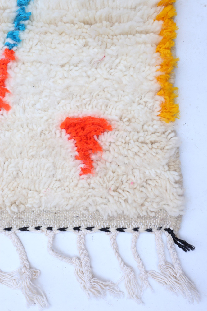 Dieser Berber-Teppich, genannt Azilal, hat seinen Namen von der Region Azilal in Marokko, wo er von Hand auf einem traditionellen hölzernen Webstuhl hergestellt wurde. Seine Muster spiegeln die Stimmungen, Lieben und Leiden der Weberin zum Zeitpunkt seiner Entstehung wider. Nachdem dieser bunte Berber-Teppich fertiggestellt ist, wird sie einen völlig anderen herstellen, je nach ihren aktuellen Emotionen. Jedes Stück ist also einzigartig.