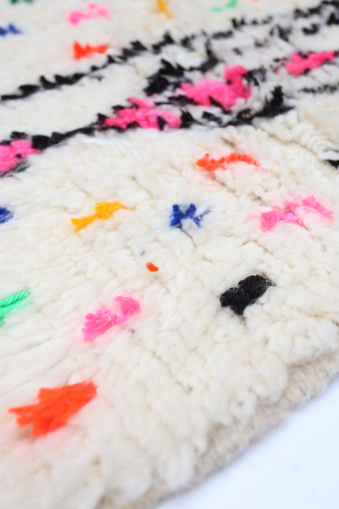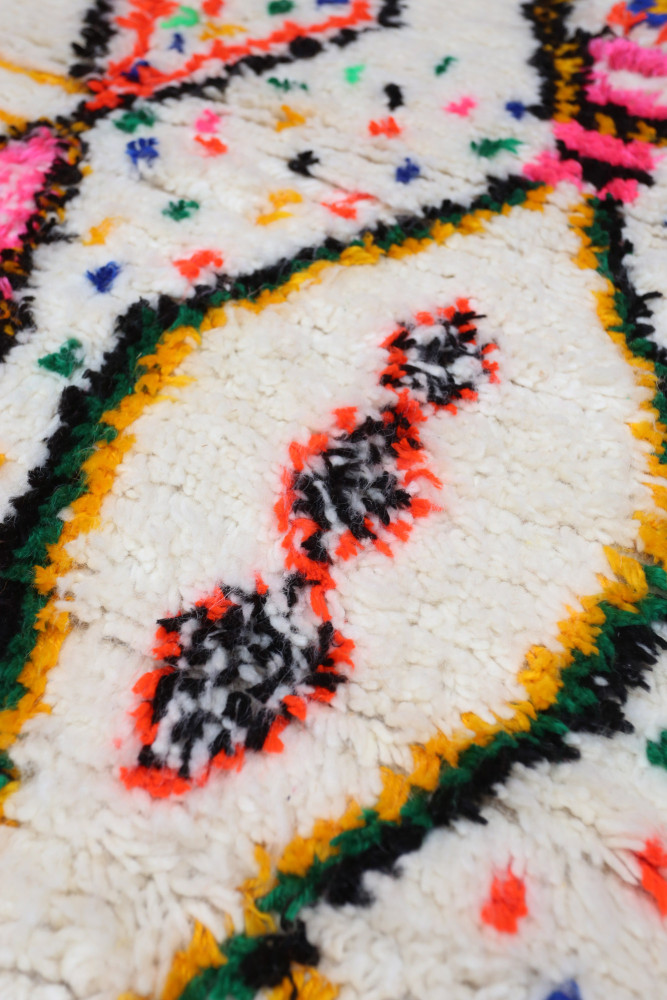 Dieser Berber-Teppich, genannt Azilal, hat seinen Namen von der Region Azilal in Marokko, wo er von Hand auf einem traditionellen hölzernen Webstuhl hergestellt wurde. Seine Muster spiegeln die Stimmungen, Lieben und Leiden der Weberin zum Zeitpunkt seiner Entstehung wider. Nachdem dieser bunte Berber-Teppich fertiggestellt ist, wird sie einen völlig anderen herstellen, je nach ihren aktuellen Emotionen. Jedes Stück ist also einzigartig.
