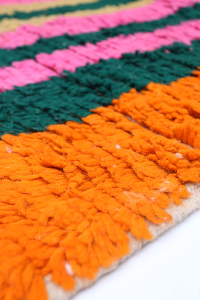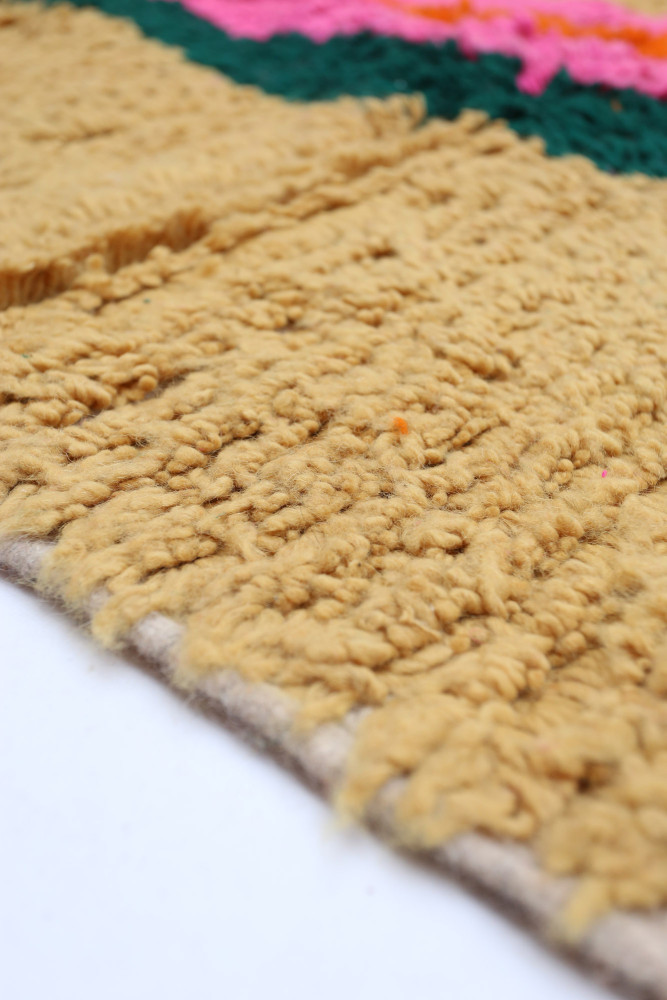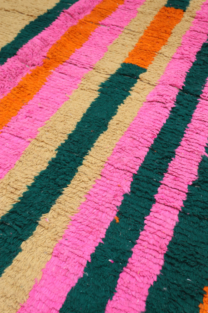 Dieser Berber-Teppich, genannt Azilal, hat seinen Namen von der Region Azilal in Marokko, wo er von Hand auf einem traditionellen hölzernen Webstuhl hergestellt wurde. Seine Muster spiegeln die Stimmungen, Lieben und Leiden der Weberin zum Zeitpunkt seiner Entstehung wider. Nachdem dieser bunte Berber-Teppich fertiggestellt ist, wird sie einen völlig anderen herstellen, je nach ihren aktuellen Emotionen. Jedes Stück ist also einzigartig.