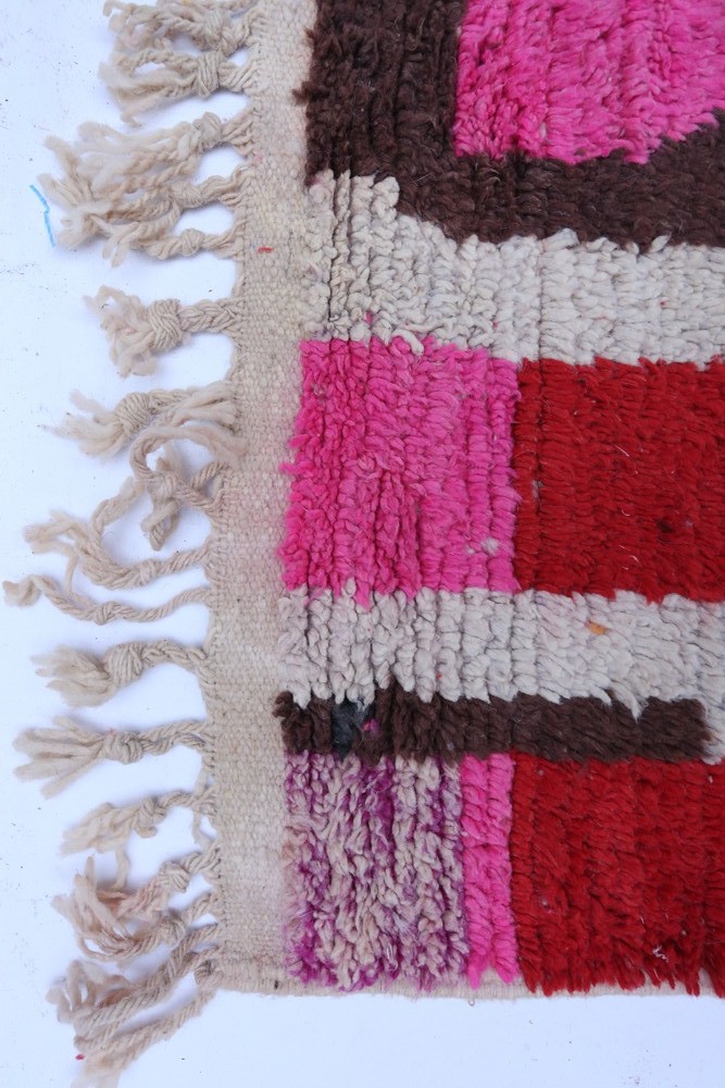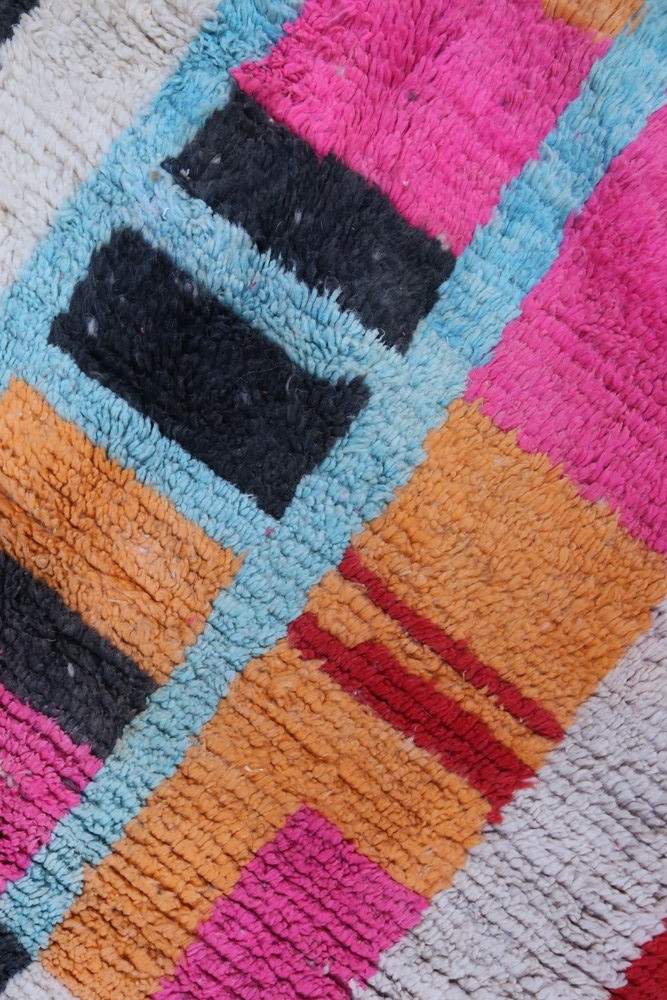 Dieser als Azilal bezeichnete Berber-Teppich hat seinen Namen von der Region Azilal in Marokko, wo er von Hand auf einem traditionellen hölzernen Webstuhl hergestellt wurde. Seine Muster spiegeln die Stimmungen, Lieben und Leiden der Weberin zum Zeitpunkt seiner Entstehung wider. Nachdem dieser bunte Berber-Teppich geschaffen wurde, wird sie einen völlig anderen Teppich herstellen, abhängig von ihren Gefühlen in diesem Moment. Jedes Stück ist daher ein Unikat.