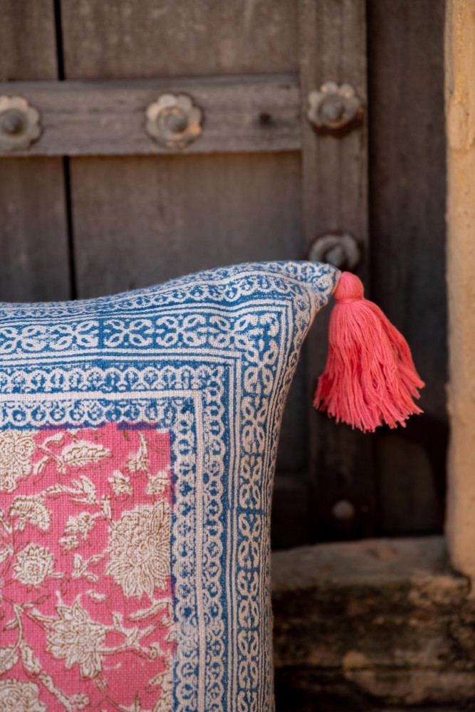 Die Muster werden ebenfalls vollständig von Hand gefertigt, dank der Blockdruck-Technik: Holzblöcke, die von Hand geschnitzt und in natürliche Farbstoffe getaucht werden, sorgen für ein einzigartiges und authentisches Ergebnis.