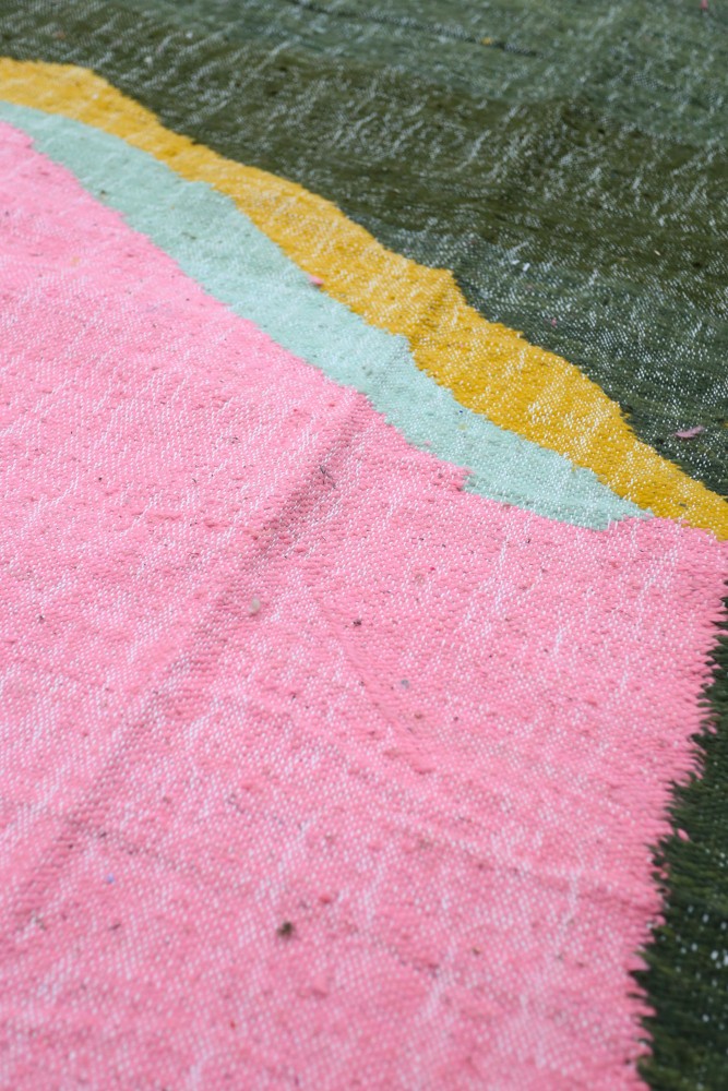 Sehr großer moderner Berber-Kilim-Teppich aus grüner, rosa und gelber Wolle.