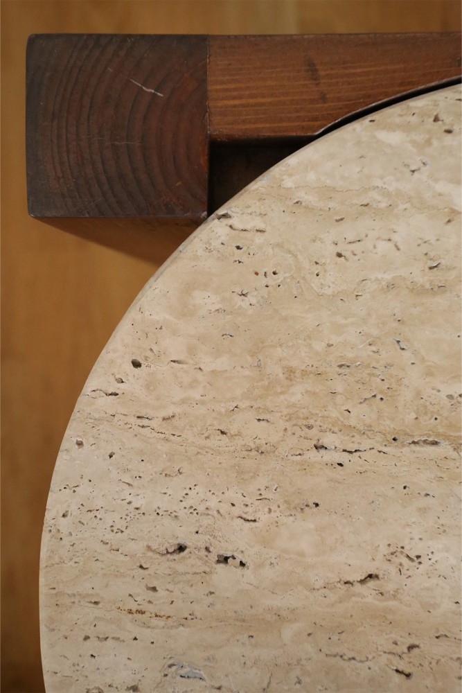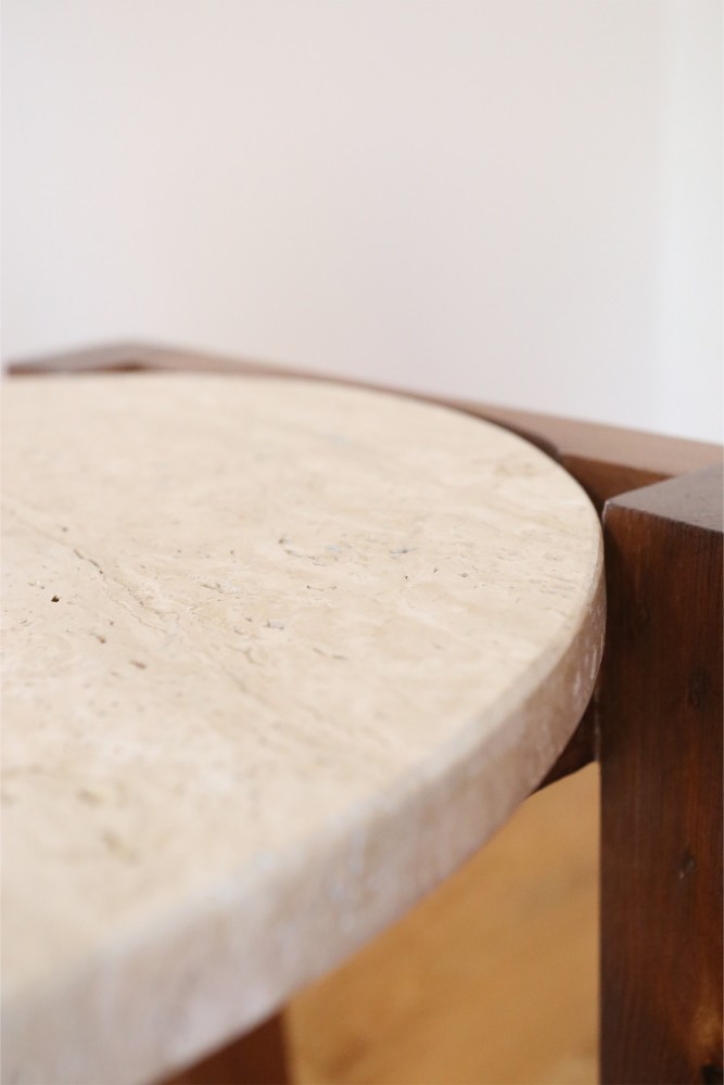 Travertin- und roter Fichtenholz-Couchtisch, entworfen von Marion, der Gründerin von THEM, und zu 100% handgefertigt in einer unserer talentierten Partnerwerkstätten in Marokko.