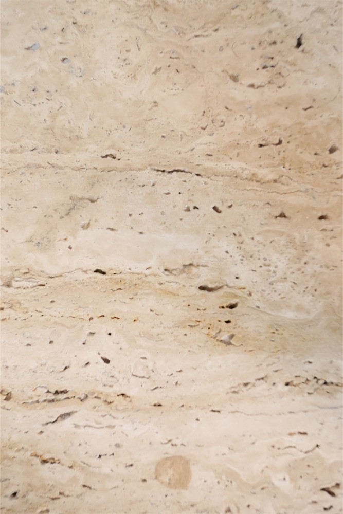 Beistelltisch aus beigem Travertin und Holz, handgefertigt in Marokko. Travertin- und Holz-Couchtischende Travertin- und Holz-Couchtischende