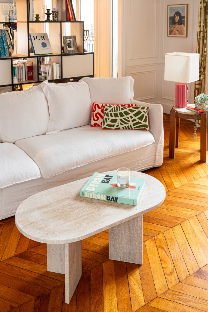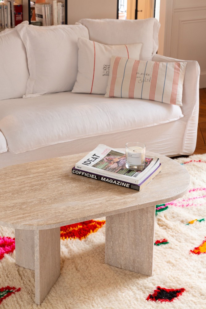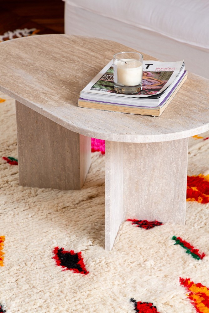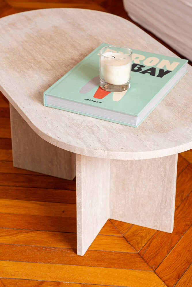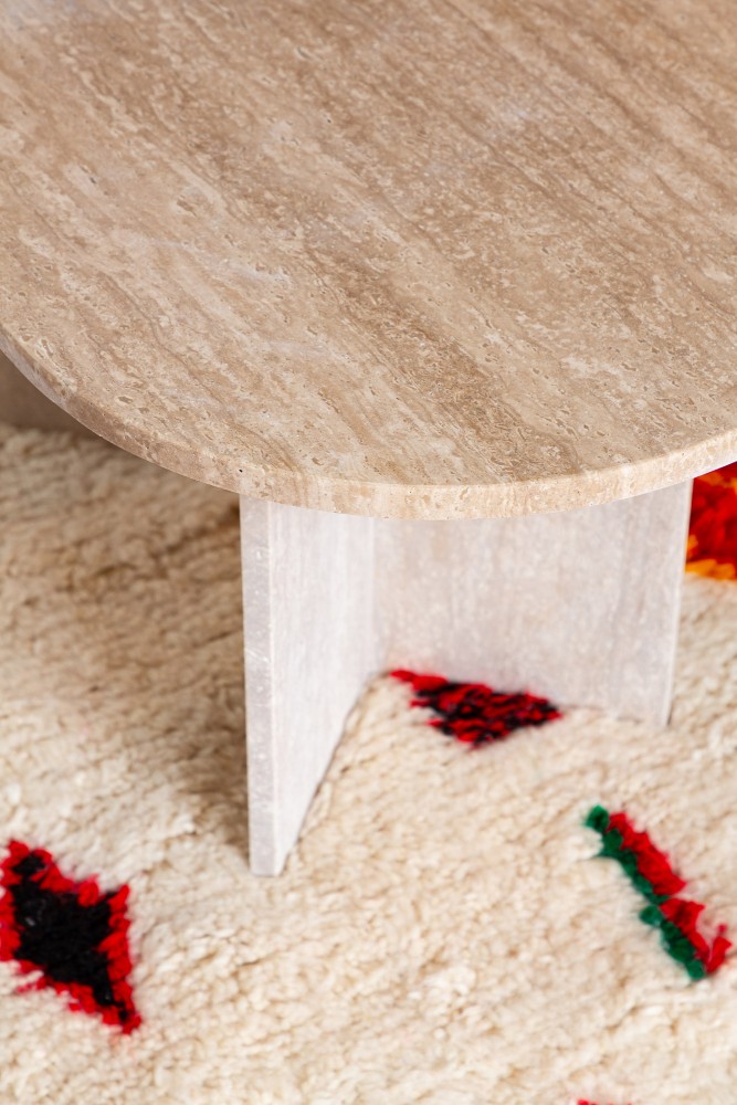 Café-Tisch aus Travertin, entworfen von Marion, der Gründerin von Them, und zu 100% handgefertigt in Marokko in einer unserer talentierten Partnerwerkstätten.