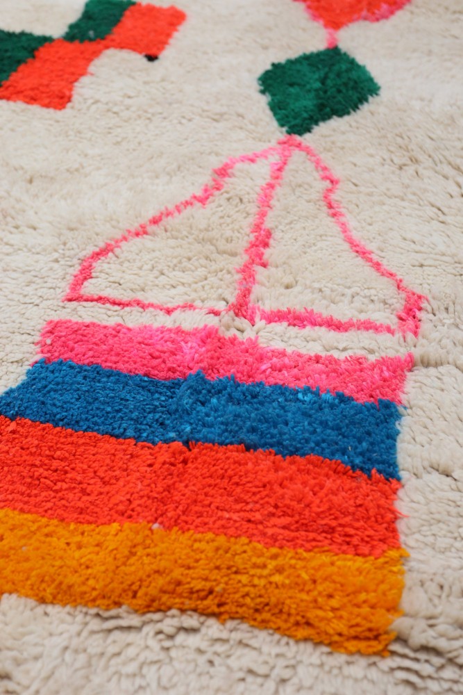 Dieser Berber-Teppich namens Azilal hat seinen Namen von der Region Azilal in Marokko, wo er von Hand auf einem traditionellen Holzwebstuhl hergestellt wurde. Seine Muster spiegeln die Stimmungen, Lieben und Leiden der Weberin zum Zeitpunkt seiner Herstellung wider. Nachdem dieser bunte Berber-Teppich hergestellt wurde, wird sie ein völlig anderes Stück passend zu ihren aktuellen Emotionen anfertigen. Jedes Stück ist daher ein Unikat.