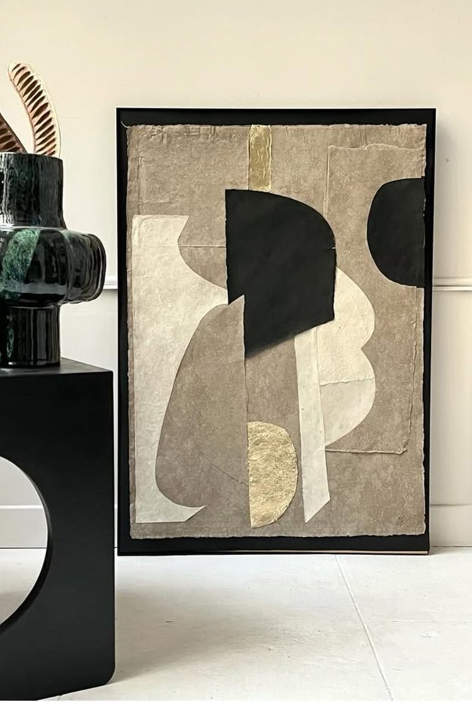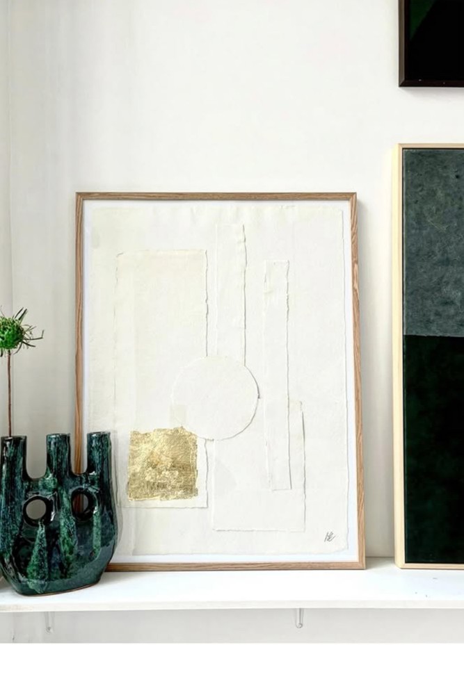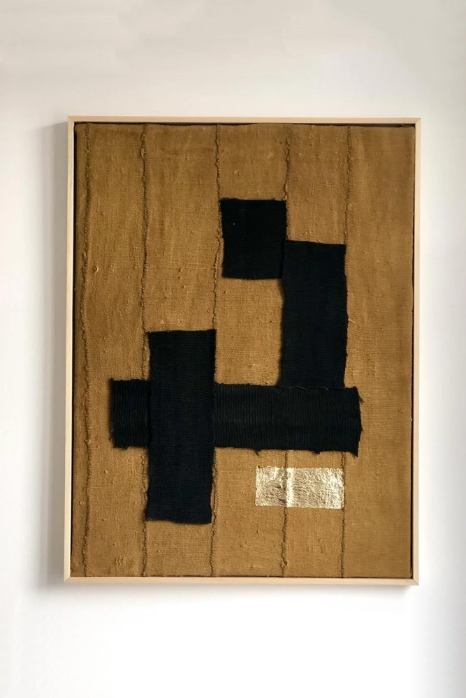 Canvas collage of hemp and gold leaf. Floating House.