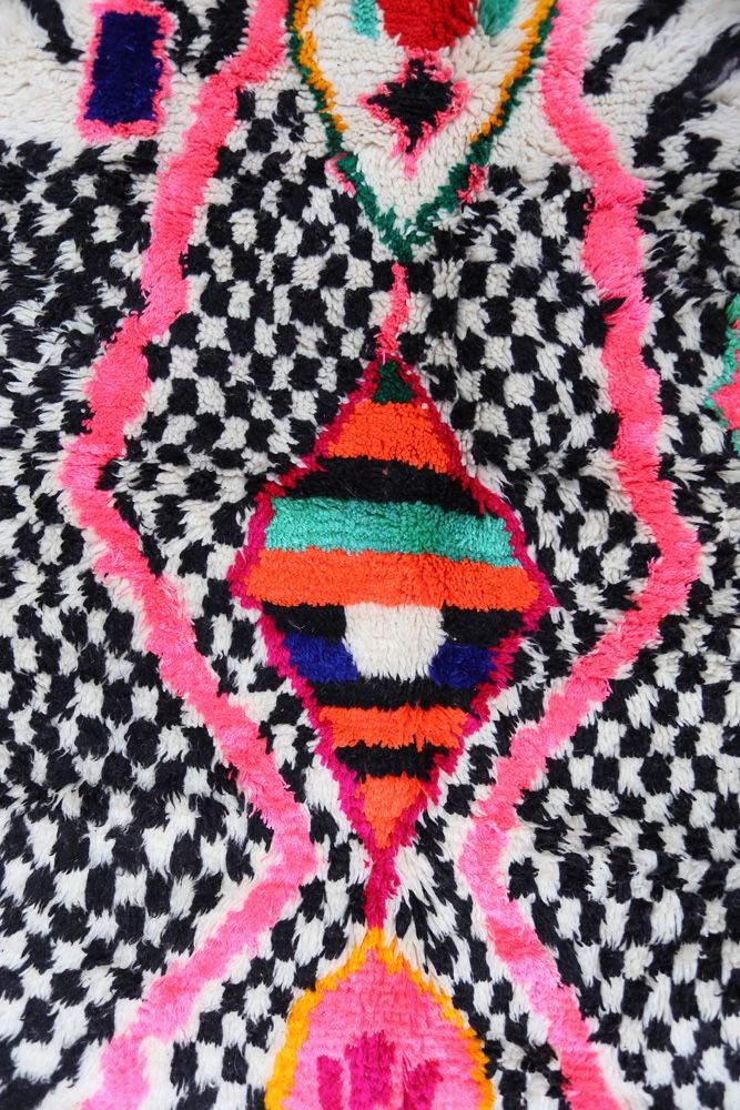 Comes from a tribe in the rocky and high region of Azilal, located in the High Atlas mountains. This red Berber carpet features numerous abstract motifs with several Berber symbols. This carpet, with long or short pile, highlights the color, often on a beige, white, or ecru background.You can find models that highlight the color red with geometric patterns symbolizing fertility, protection, nature, luck, or home.(the patterns will mainly be diamonds, there are fewer polka dot Berber carpets for the Azilal tribe). These Moroccan carpet designs are often associated withfluorescent Berber rugsBy their mixture of bright and shimmering colors.