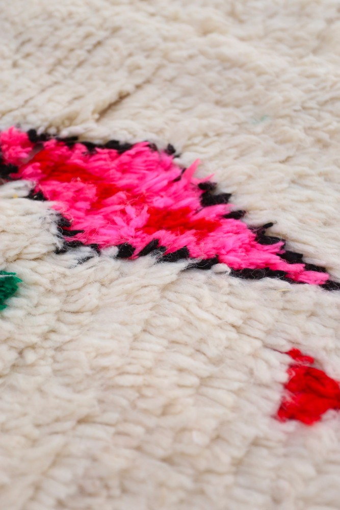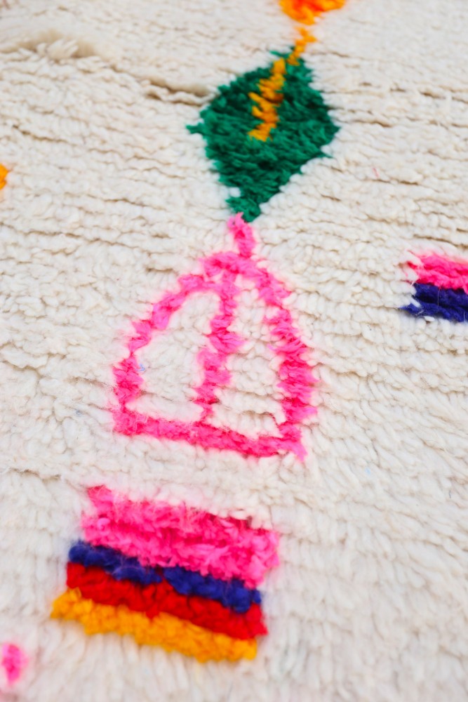 This Berber carpet called Azilal gets its name from the Azilal region in Morocco where it was handcrafted on a traditional wooden loom. Its patterns represent the weaver’s moods, loves, and sorrows at the time of creation. Once this colorful Berber carpet is created, she will make another one entirely different, based on her current emotions. Each piece is therefore unique.