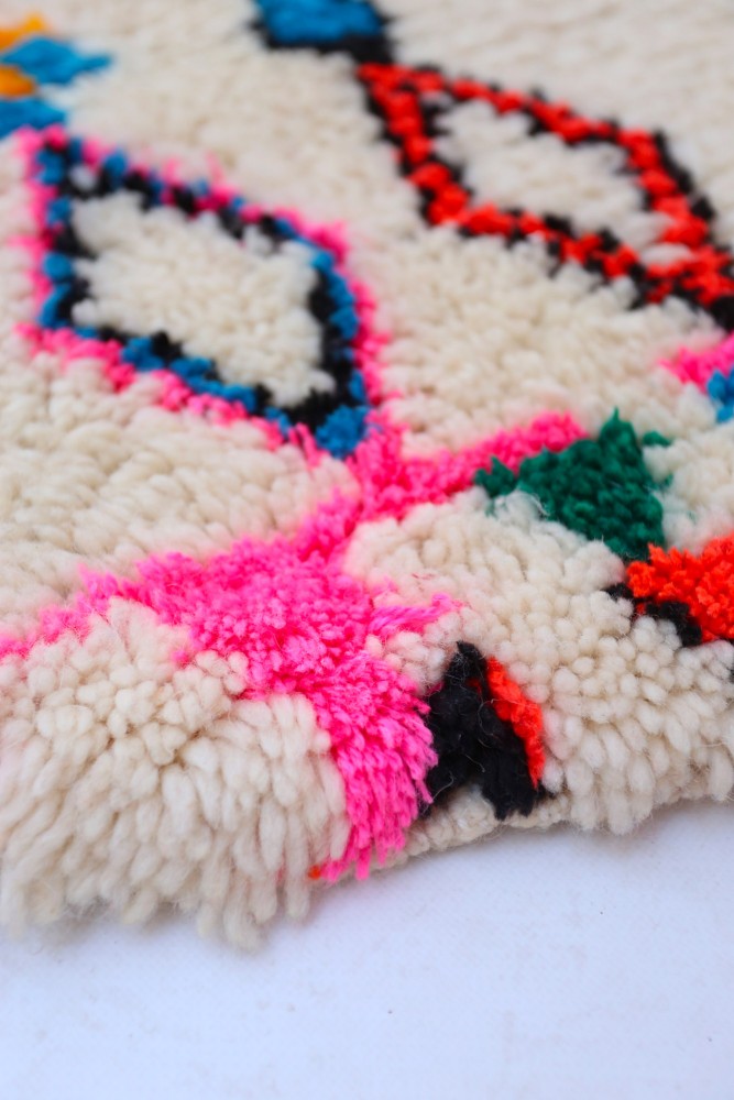 This Berber carpet called Azilal gets its name from the Azilal region in Morocco where it was handcrafted on a traditional wooden loom. Its patterns represent the weaver’s moods, loves, and sorrows at the time of creation. Once this colorful Berber carpet is created, she will make another one entirely different, based on her current emotions. Each piece is therefore unique.