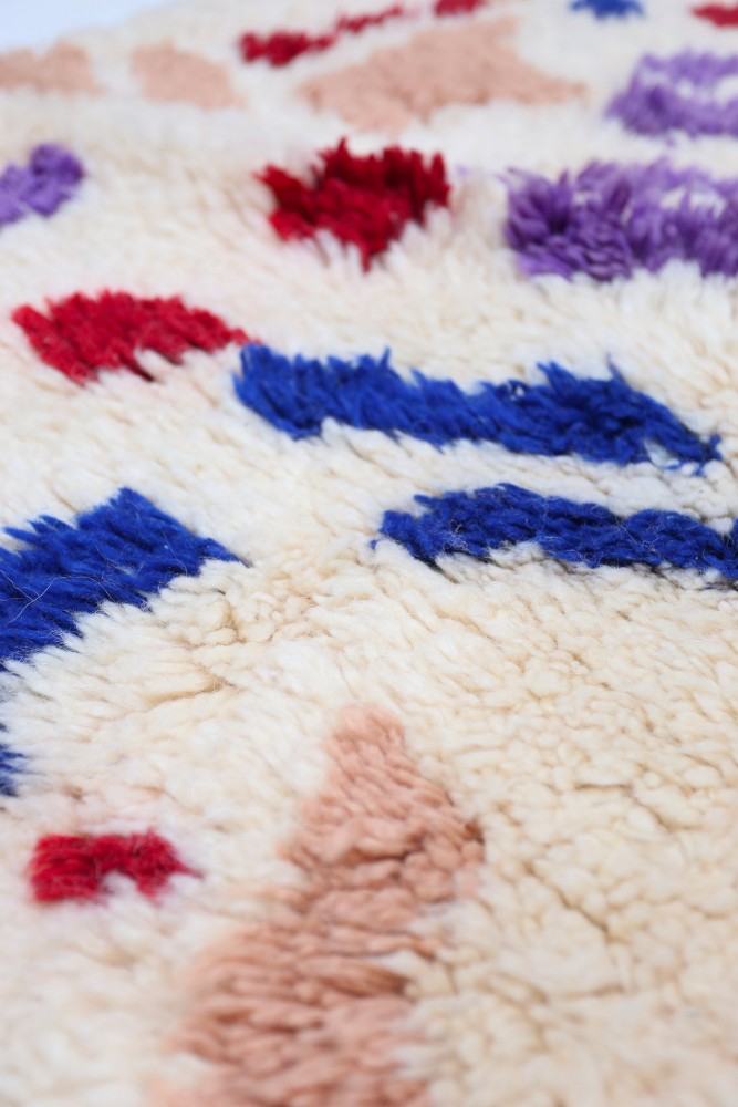This Berber carpet called Azilal gets its name from the Azilal region in Morocco where it was handcrafted on a traditional wooden loom. Its patterns represent the weaver’s moods, loves, and sorrows at the time of creation. Once this colorful Berber carpet is created, she will make another one entirely different, based on her current emotions. Each piece is therefore unique.